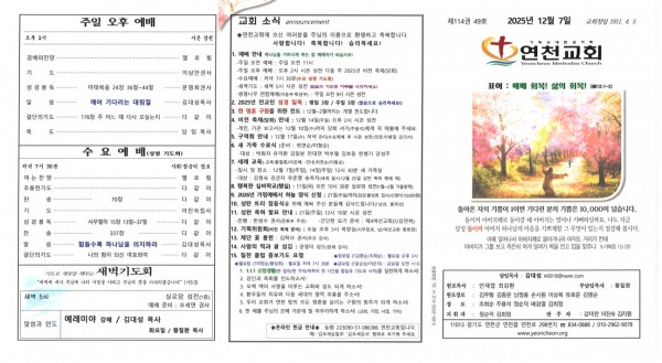 1. 예배 안내 하나님을 기쁘시게 하는 참 예배자가 되십시오! -주일 오전 예배 : 주일 오전 11시 -주일 오후 예배 : 오후 2시 시온 성전 다음 주 2025년 비전 축제(당회) -수요예배 : 저녁 7시 30분(수요 성령 기도회) -새벽기도 : 새벽 5시 시온 성전 말씀과 기도로 하루를 시작하세요! -생명나무 연합예배(아동부·학생부) : 주일 오전 9시 시온 성전 2. 2025년 전교인 성경 일독 : 평일 3장 / 주일 5장 (말씀으로 승리하세요!) 3. 한 영혼 구원을 위한 전도 : 1…