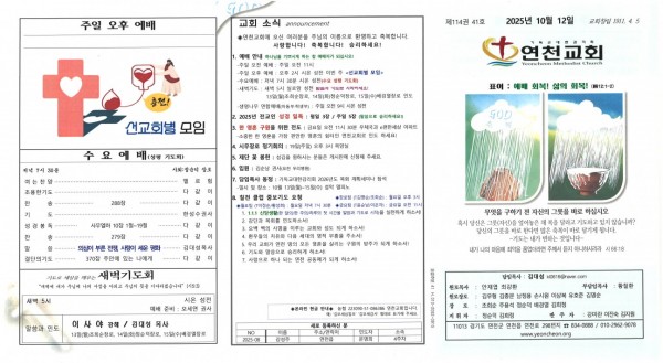 1. 예배 안내 하나님을 기쁘시게 하는 참 예배자가 되십시오! -주일 오전 예배 : 주일 오전 11시 -주일 오후 예배 : 오후 2시 시온 성전 이번 주 -수요예배 : 저녁 7시 30분 시온 성전(수요 성령 기도회) -새벽기도 : 새벽 5시 실로암 성전 말씀과 기도로 시작하세요! 13일(월)조희순장로, 14일(화)정순덕장로, 15일(수)배경열장로 인도 -생명나무 연합예배(아동부·학생부) : 주일 오전 9시 시온 성전 2. 2025년 전교인 성경 일독 : 평일 3장 / …