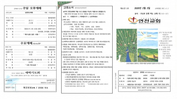 1.예배 안내 -하나님께서 기뻐하시는 참된 예배자의 삶이 되시기를 소망합니다. -금주오후예배 : 임원 헌신예배 ▸사회 : 이상복. 기도 : 김연복. 성경 : 정애자 ▸특송 : 장로(T이상복), 권사(T정길순), 집사(T최연순)   2.사랑건축의 마무리와 준공을 위해 기도해 주세요. 관심을 가지시고 수시로 오셔서 사랑의 마음으로 청소와 정리정돈에 함께 해 주시기를 바랍니다.   3.연천지방 과정 및 자격고시 : 8일(토…