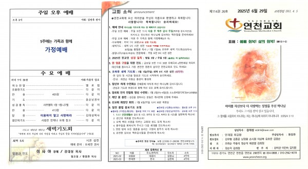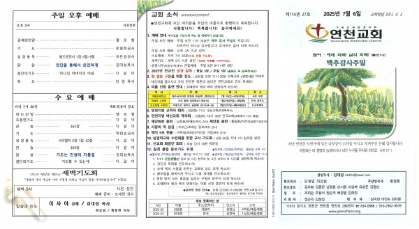 1. 예배 안내 하나님을 기쁘시게 하는 참 예배자가 되십시오! -주일 오전 예배 : 주일 오전 11시 다음 주 맥추 감사 주일(맥추절 장식:이은경) 지키시고 인도하신 하나님께 감사하는 맥추절을 준비하세요! -주일 오후 예배 : 이번 주 가족과 함께 가정예배(5주 차) -수요예배 : 저녁 7시 30분(수요 성령 기도회) -새벽기도 : 새벽 5시 시온 성전 기도로 하루를 시작하세요! 30일(월) 황철환 목사 / 7월 1일(화) 초하루 새벽 기도회(담임목사) -생명나…