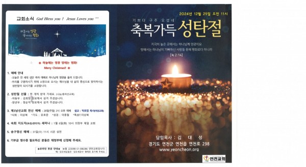 누가복음 2장 10절 ~ 11절 "모두를 위한 성탄" ◆ 연천감리교회 예배 시간 안내 - 주일 오전 예배 : 11시 - 주일 오후 예배 : 오후 2시 - 수요예배 : 저녁 7시 30분 - 금요 성령 기도회 : 매월 마지막 주 금요일 저녁 8시 - 새벽기도 : 매일 새벽 5시 ◆ 담임목사 김대성(010-2962-9078) - 주소 : 경기도 연천군 연천읍 연천로 298 - 전화 : 031-833-0888 ◆ 온라인 헌금 안내 - 계좌번호 : 농협 223090-51-086386(예금주:연천교회)