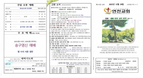 1. 예배 안내 하나님을 기쁘시게 하는 참 예배자가 되십시오! -주일 오전 예배 : 주일 오전 11시 -주일 오후 예배 : 주일 오후 2시 이번 주 사회/이상복 기도/유호준 성경/이종철 특송T/이상복 설교/박호엽 목사(마암교회) -수요예배 : 이번 주 송구영신 예배 -새벽기도 : 새벽 5시 시온 성전 말씀과 기도로 하루를 시작하세요! -생명나무 연합예배(아동부·학생부) : 주일 오전 9시 시온 성전 2. 2025년 전교인 성경 일독 : 평일 3장 / 주일 5장 (…