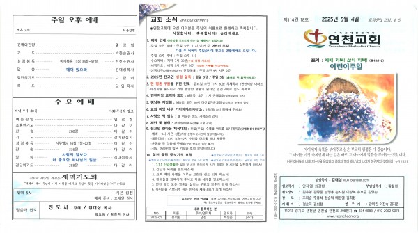 1. 예배 안내 하나님을 기쁘시게 하는 참 예배자가 되십시오! -주일 오전 예배 : 주일 오전 11시 이번 주 어린이 주일 다음 주 어버이 주일(9시에 전교인 연합예배로 드립니다.) -주일 오후 예배 : 주일 오후 2시 -수요예배 : 저녁 7시 30분(수요 성령 기도회) -새벽기도 : 새벽 5시 시온 성전 기도로 하루를 시작하세요! -생명나무(아동부/학생부) 연합예배 : 주일 오전 9시 시온 성전 2. 2025년 전교인 성경 일독 : 평일 3장 / 주일 5장 (올해도 꼭 일독하세요)3…