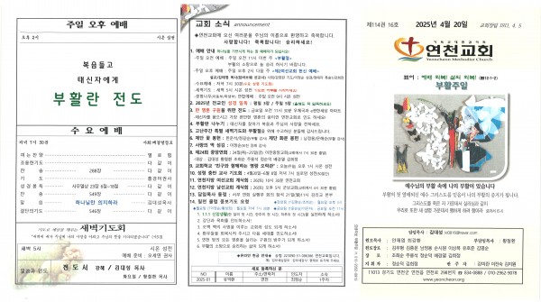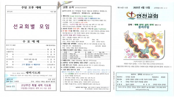 1. 예배 안내 하나님을 기쁘시게 하는 참 예배자가 되십시오! -주일 오전 예배 : 이번 주 종려주일, 다음 주 부활절(성만찬 예식) -주일 오후 예배 : 이번 주 선교회별 모임 다음 주 태신자에게 부활란 전도 -수요예배 : 저녁 7시 30분(수요 성령 기도회) -새벽기도 : “고난주간 특별 새벽 기도”(14일~19일) 새벽 5시 시온 성전 -생명나무(아동부/학생부) 연합예배 : 주일 오전 9시 시온 성전 2. 2025년 전교인 성경 일독 : 평일 3장 / 주일 5장 (올해도 꼭 일독하세요)3. 한 영혼 구원을 위한 전도…