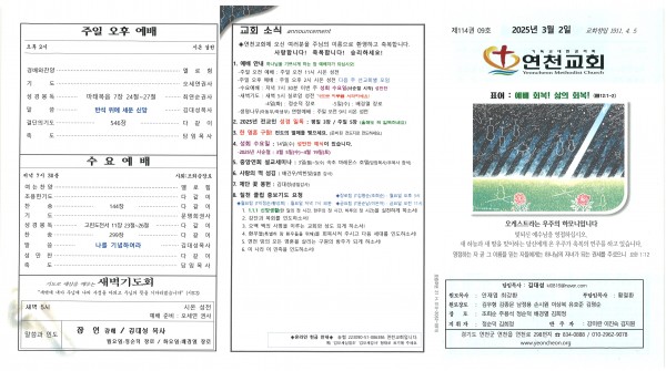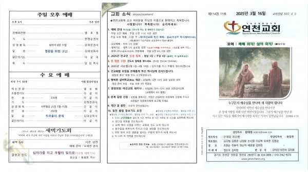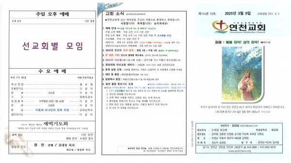 1. 예배 안내 하나님을 기쁘시게 하는 참 예배자가 되십시오! -주일 오전 예배 : 주일 오전 11시 시온 성전 -주일 오후 예배 : 주일 오후 2시 시온 성전 이번 주 선교회별 모임 -수요예배 : 저녁 7시 30분 이번 주 -새벽기도 : 새벽 5시 실로암 성전 기도로 하루를 시작하세요! -생명나무(아동부/학생부) 연합예배 : 주일 오전 9시 시온 성전 2. 2025년 전교인 성경 일독 : 평일 3장 / 주일 5장 (올해도 꼭 일독하세요)3. 한 영혼 구원! 전도의 열매를 맺으세요. (준비된 전도지로 전도하세요.)4.…