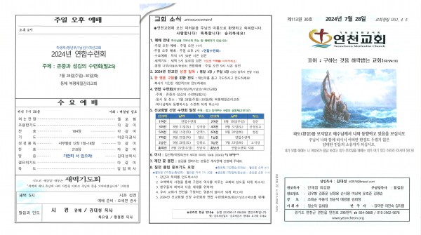 에스겔 36장 25절 ~ 27절 "올여름 다시 회복하게 하소서!" ◆ 연천감리교회 예배 시간 안내 - 주일 오전 예배 : 11시 - 주일 오후 예배 : 오후 2시 - 수요예배 : 저녁 7시 30분 - 금요 성령 기도회 : 매월 마지막 주 금요일 저녁 8시 - 새벽기도 : 매일 새벽 5시 ◆ 담임목사 김대성(010-2962-9078) - 주소 : 경기도 연천군 연천읍 연천로 298 - 전화 : 031-833-0888 ◆ 온라인 헌금 안내 - 계좌번호 …