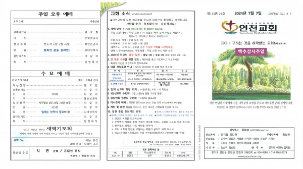 1. 예배 안내 하나님을 기쁘시게 하는 참 예배자가 되십시오! -주일 오전 예배 : 주일 오전 11시 오늘은 맥추 감사 주일로 지킵니다. 지키시고 인도하신 하나님 감사합니다! -주일 오후 예배 : 주일 오후 2시 -수요예배 : 저녁 7시 30분 시온 성전 -새벽기도 : 새벽 5시 실로암 성전 기도로 하루를 시작하세요! -생명 나무(아동부/학생부) 연합예배 : 주일 오전 9시 시온 성전 2. 2024년 전교인 성경 일독 : 평일 3장 / 주일 5장 (성경 일독자 연말 시상)3…