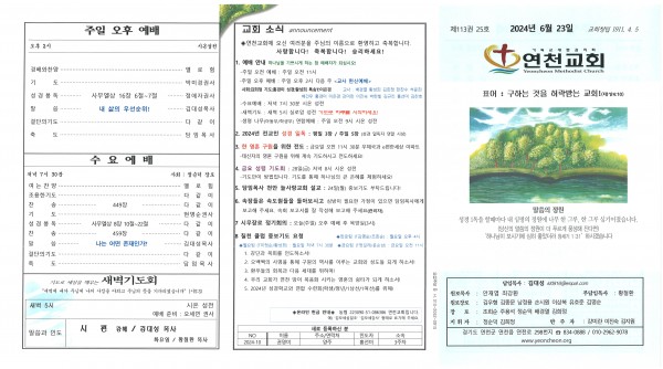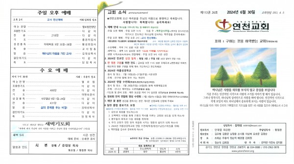 1. 예배 안내 하나님을 기쁘시게 하는 참 예배자가 되십시오! -주일 오전 예배 : 주일 오전 11시 다음 주 (맥추절 장식:이은경) 지키시고 인도하신 하나님께 감사하는 맥추절을 준비하세요! -주일 오후 예배 : 주일 오후 2시 사회:김희정 기도:홍경미 성경:황성희 특송T:이은경 교사 : 배경열 황성희 김희정 한찬수 석윤희 배건우 홍경미 이은경 강미란 이진숙 박한빛 김규리 홍선미 김찬호 -수요예배 : 저녁 7시…