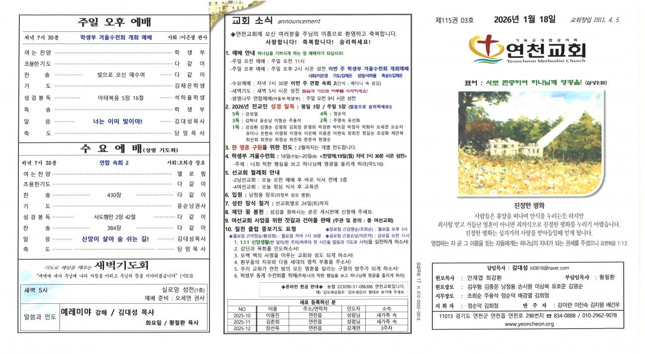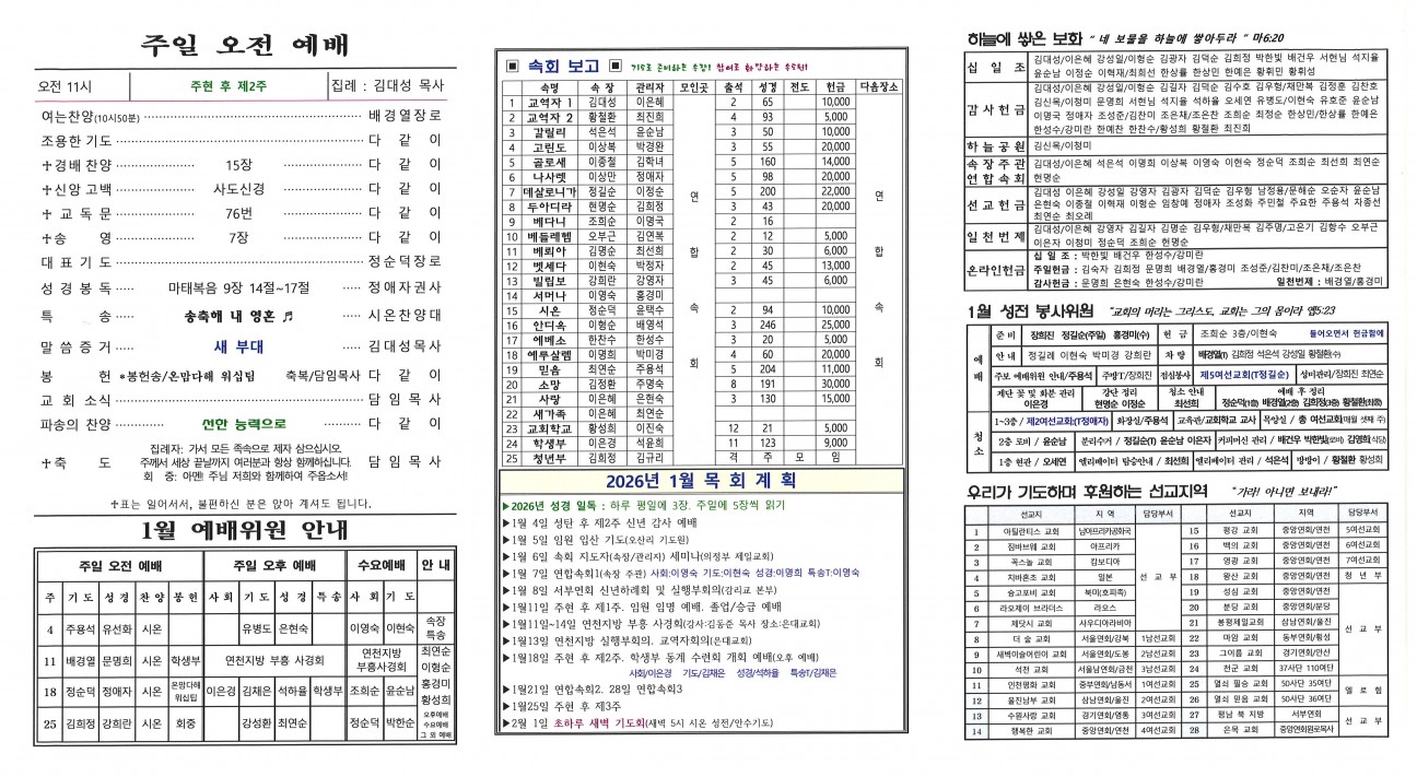 2026년 1월 18일 교회주보 본문 2026년 1월 18일 교회주보2026년 1월 18일 교회주보 샬롬 연천교회 조회 40회 2026-01-17 11:40 목록 댓글목록 이전글 2026년 1월 25일 교회주보 26.01.24 다음글 2025년 1월 11일 교회주보 26.01.10