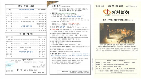 1. 예배 안내 하나님을 기쁘시게 하는 참 예배자가 되십시오! -주일 오전 예배 : 주일 오전 11시 다음 주 설교:안재엽 원로 목사 온전한 감사로 하나님을 기쁘시게 하는 삶이 되세요!! -주일 오후 예배 : 주일 오후 2시 -수요예배 : 저녁 7시 30분 시온 성전 -새벽기도 : 새벽 5시 실로암 성전 기도로 하루를 시작하세요! -생명 나무(아동부/학생부) 연합예배 : 주일 오전 9시 시온 성전 2. 2024년 전교인 성경 일독 : 평일 3장 / 주일 5장 (성경 일독자 연말 시상)…