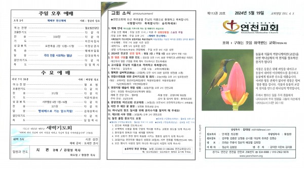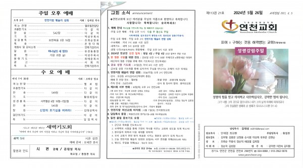 1. 예배 안내 하나님을 기쁘시게 하는 참 예배자가 되십시오! -주일 오전 예배 : 주일 오전 11시 다음 주 평신도 주일 사회:배경열. 설교:정순덕 봉헌송:시무, 원로장로 일동(T주용석) -주일 오후 예배 : 주일 오후 2시 연천지방 웨슬리 연합 성회 -수요예배 : 저녁 7시 30분 시온 성전 -새벽기도 : 새벽 5시 실로암 성전 -생명 나무(아동부/학생부) 연합예배 : 주일 오전 9시 시온 성전 2. 2024년 전교인 성경 일독 : 평일 3장 / 주일 5장 (성경 일독자…