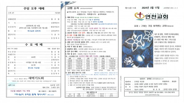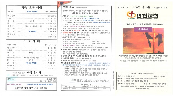 1. 예배 안내 하나님을 기쁘시게 하는 참 예배자가 되십시오! -주일 오전 예배 : 주일 오전 11시 다음 주 부활절(성만찬 예식) -주일 오후 예배 : 주일 오후 2시 다음 주 태신자 부활란 전도 사회:조희순 기도:주용석 성경:이현숙 특송T:이청미 설교:김태영 목사(짐바브웨 선교사) -수요예배 : 저녁 7시 30분 시온 성전 -새벽기도 : “고난주간 특별 새벽 기도”(25일~30일) 새벽 5시 시온 성전 -생명 나무(아동부/학생부) 연합예배 : 주일 오전 9시 시온 성전 2. 2024년 전교인 …