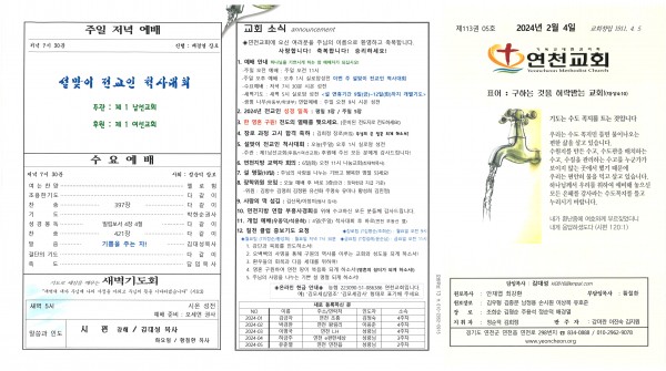 1. 예배 안내 하나님을 기쁘시게 하는 참 예배자가 되십시오! -주일 오전 예배 : 주일 오전 11시 -주일 오후 예배 : 저녁 7시 30분 시온 성전 연천지방 부흥사경회 -수요예배 : 저녁 7시 30분 시온 성전 연천지방 부흥사경회 -새벽기도 : 새벽 5시 실로암 성전 -생명 나무(아동부/학생부) 연합예배 : 주일 오전 9시 시온 성전 2. 2024년 전교인 성경 일독 : 평일 3장 / 주일 5장 3. 한 영혼 구원! 전도의 열매를 맺으세요. (준비된 전도지로 전도하세요!) 4. 연천지방 부흥사경회 : 강사/김정민…