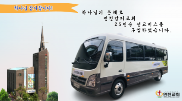 하나님의 은헤로 연천감리교회 25인승 선교버스를 구입하였습니다. 어려운 상황 가운데 구입한 버스이지만 하나…