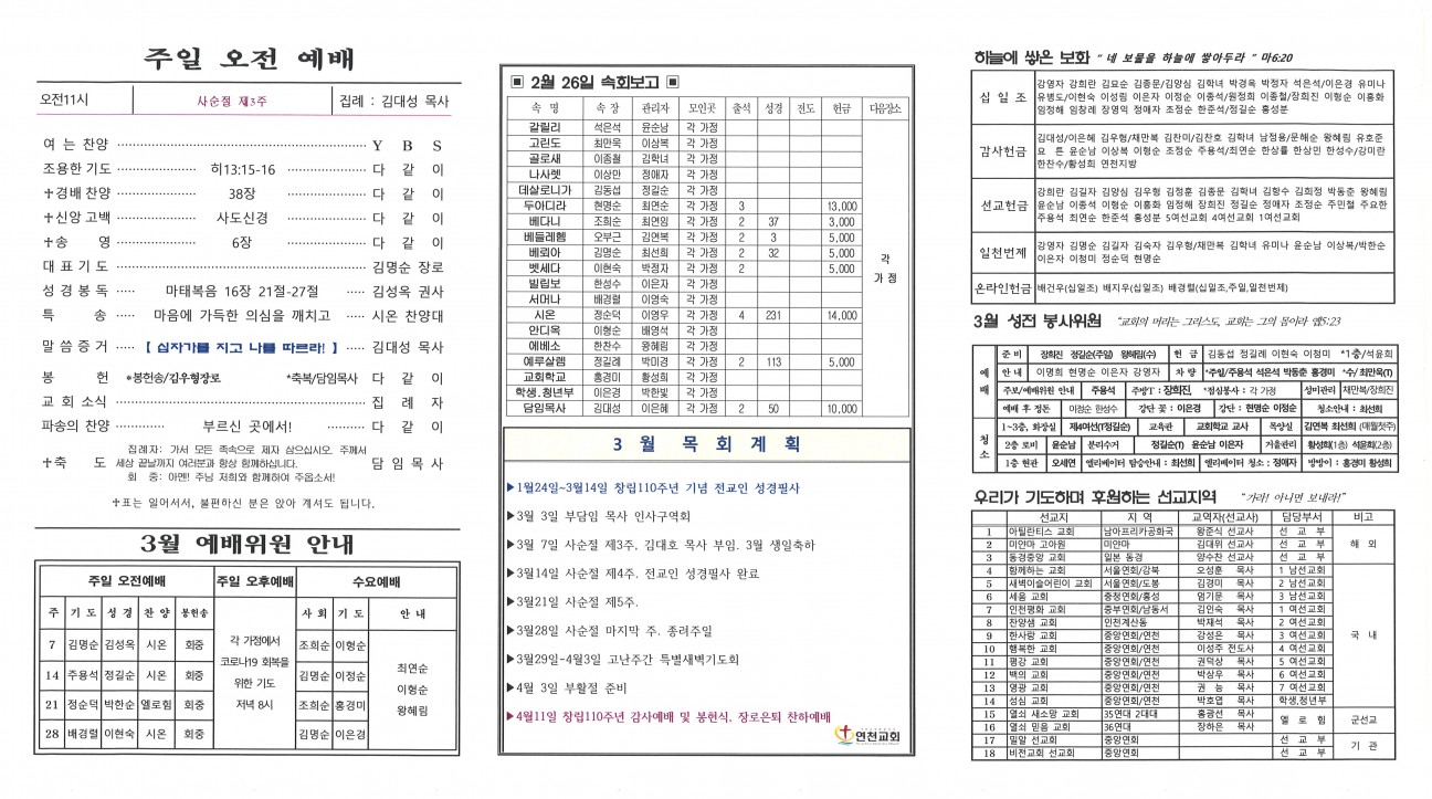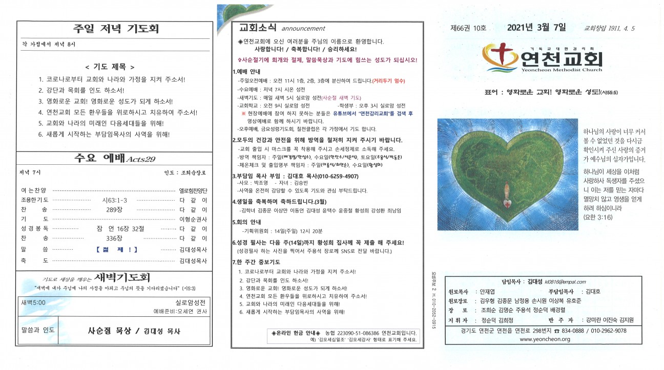 2021년 3월 7일 교회 주보 본문 2021년 3월 7일 교회 주보2021년 3월 7일 교회 주보 샬롬 연천교회 조회 1,537회 2021-03-06 13:04 목록 댓글목록 이전글 2021년 3월 14일 교회주보 21.03.13 다음글 2021년 2월 28일 교회주보 21.02.27