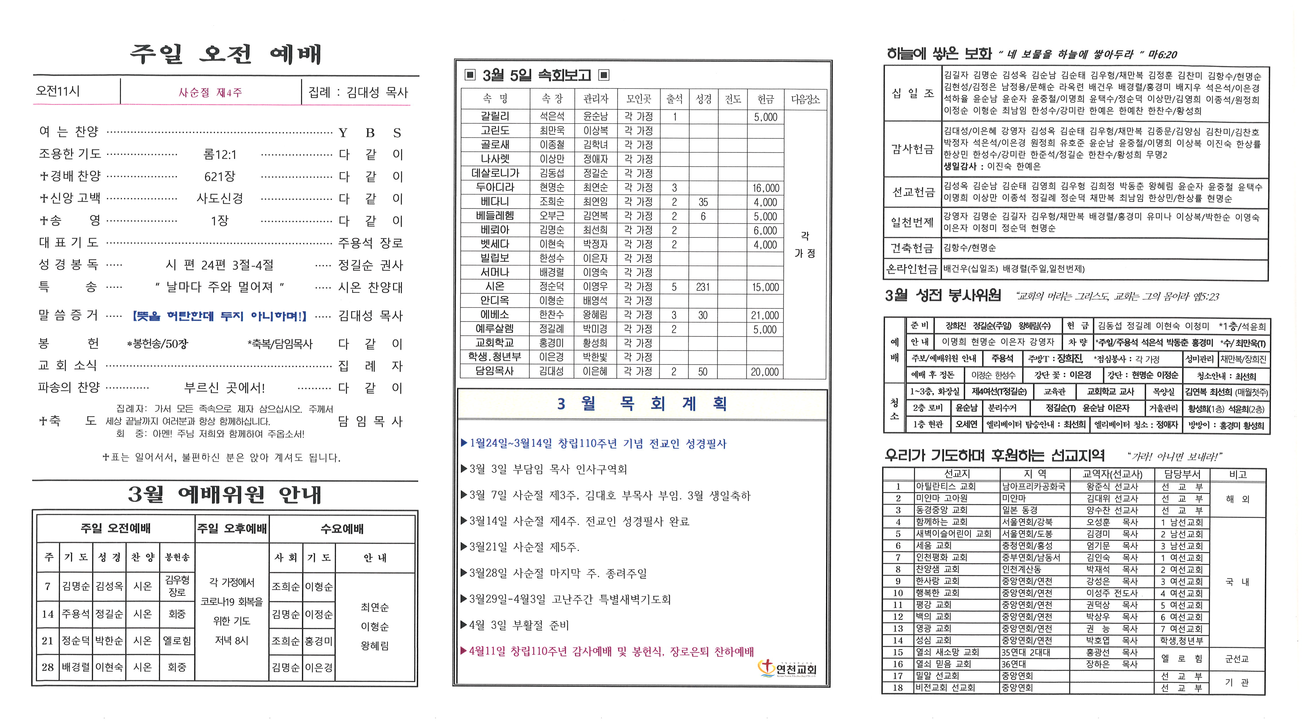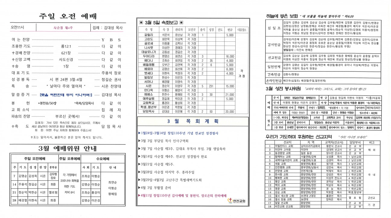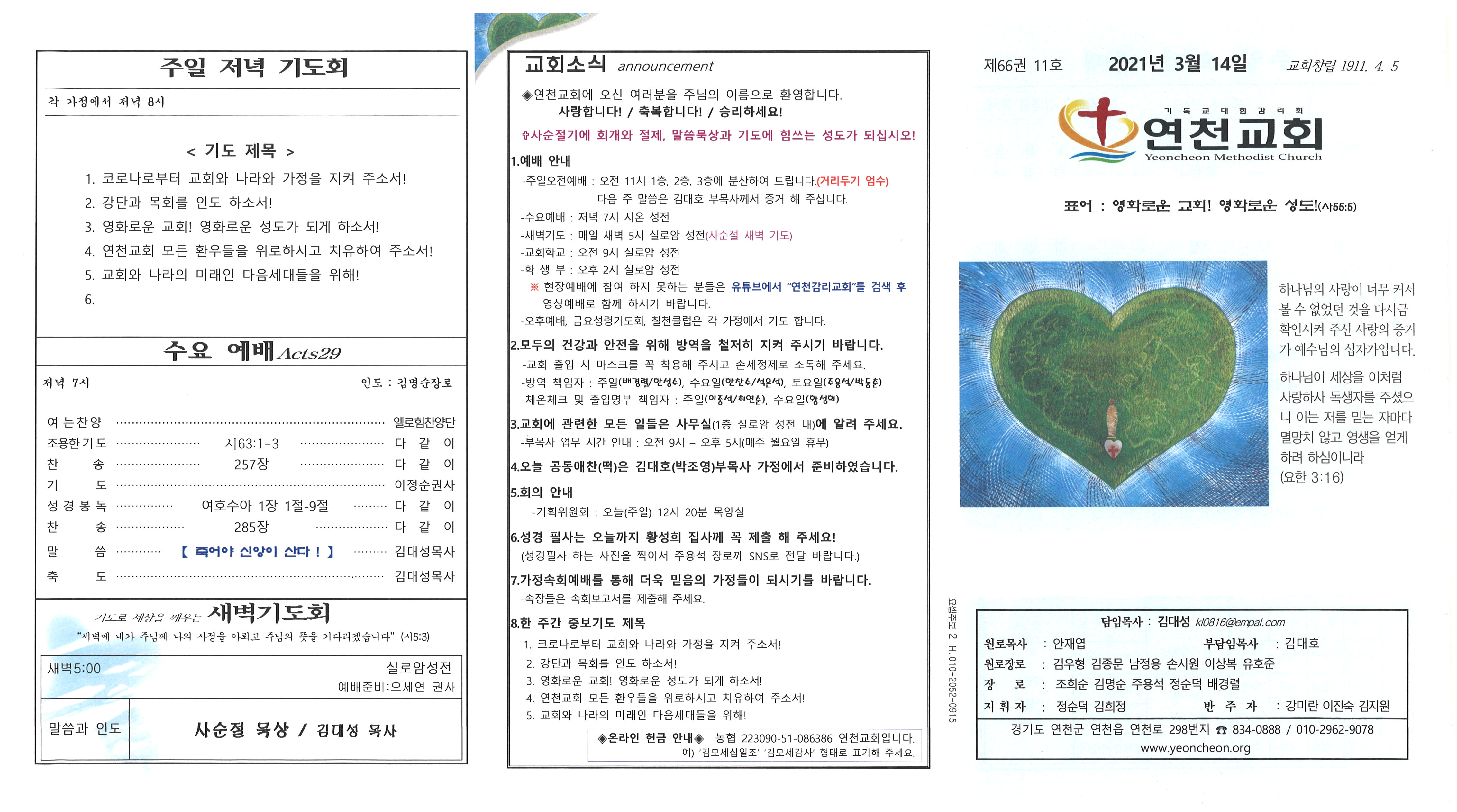 2021년 3월 14일 교회주보 본문 2021년 3월 14일 교회주보2021년 3월 14일 교회주보 샬롬 연천교회 조회 1,472회 2021-03-13 15:15 목록 댓글목록 이전글 2021년 3월 21일 교회주보 21.03.20 다음글 2021년 3월 7일 교회 주보 21.03.06