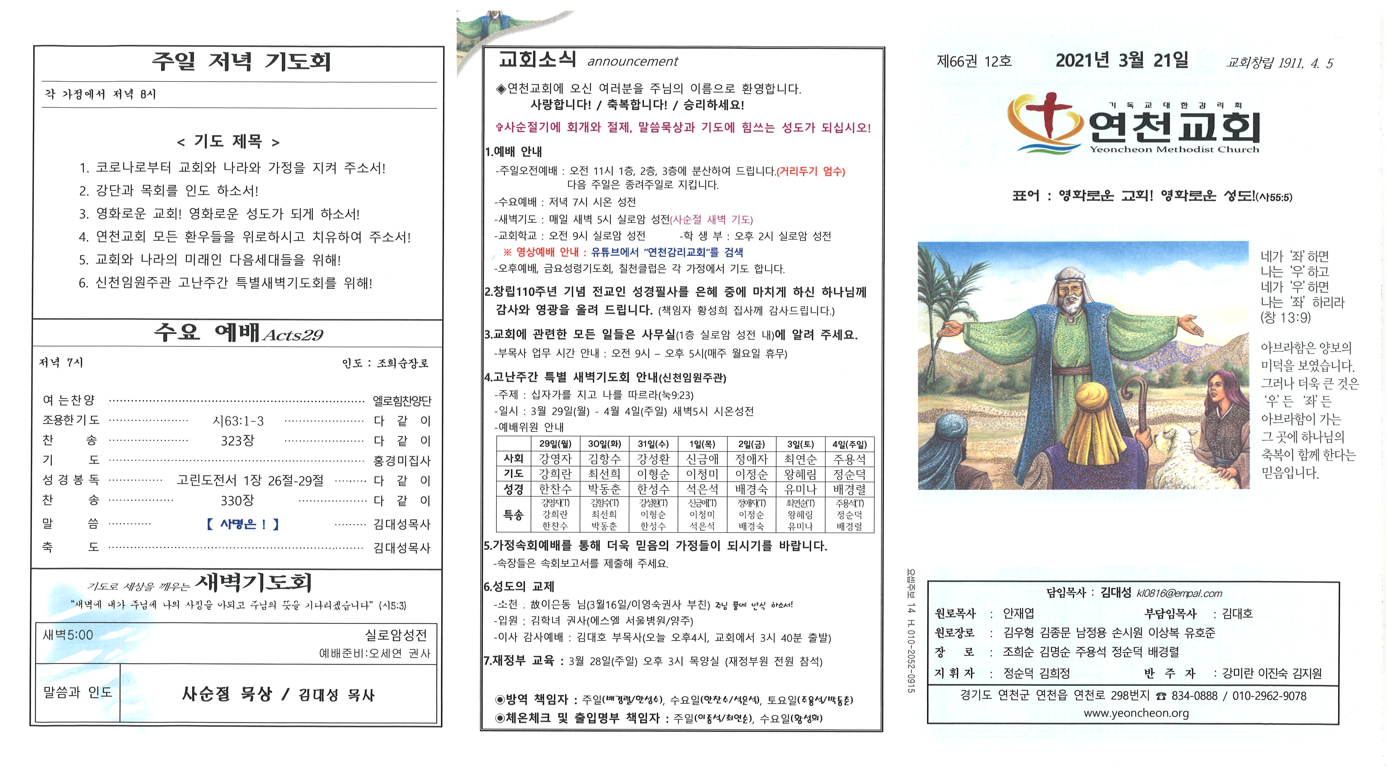 2021년 3월 21일 교회주보 본문 2021년 3월 21일 교회주보2021년 3월 21일 교회주보 샬롬 연천교회 조회 1,493회 2021-03-20 15:05 목록 댓글목록 이전글 2021년 3월 28일 교회주보 21.03.27 다음글 2021년 3월 14일 교회주보 21.03.13