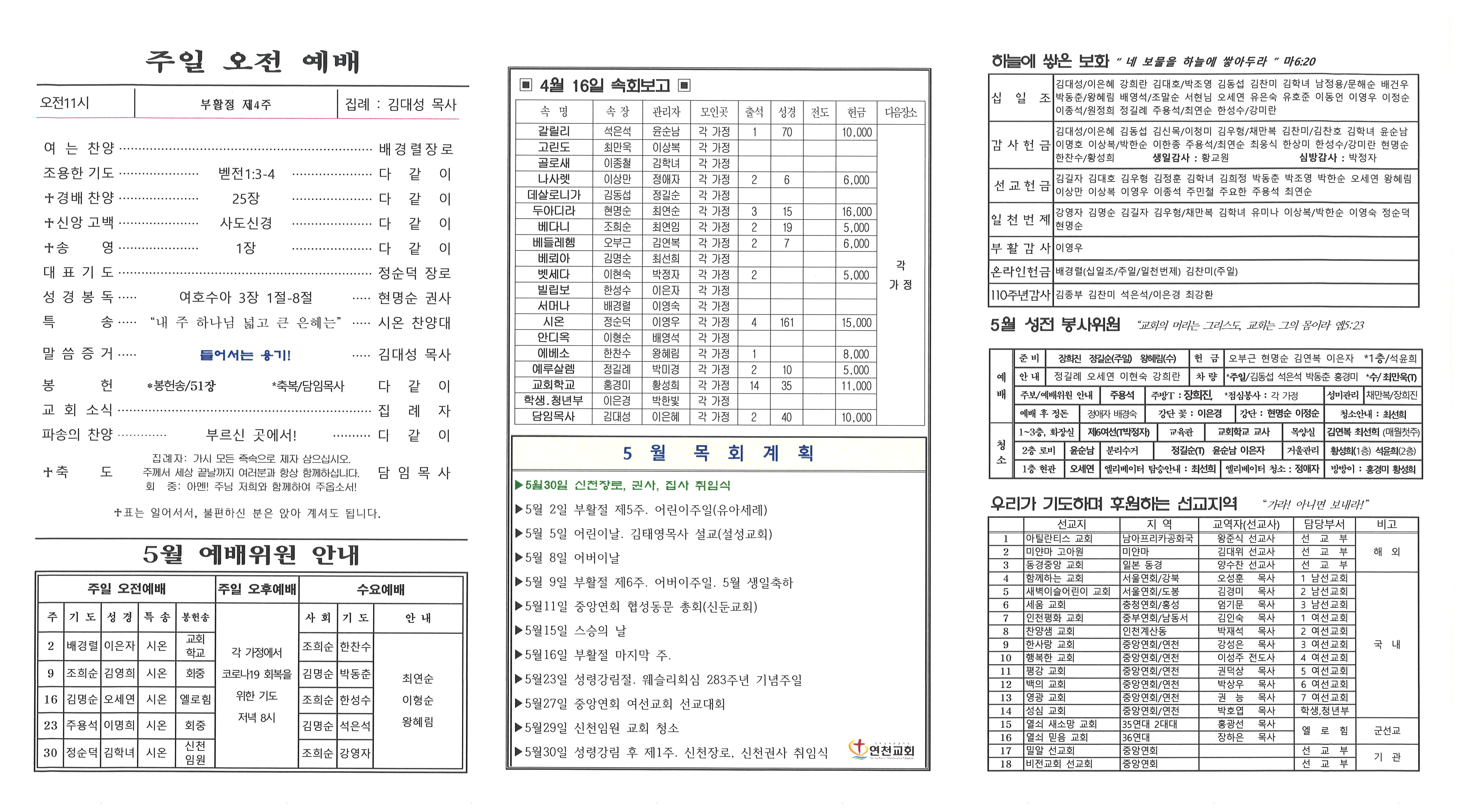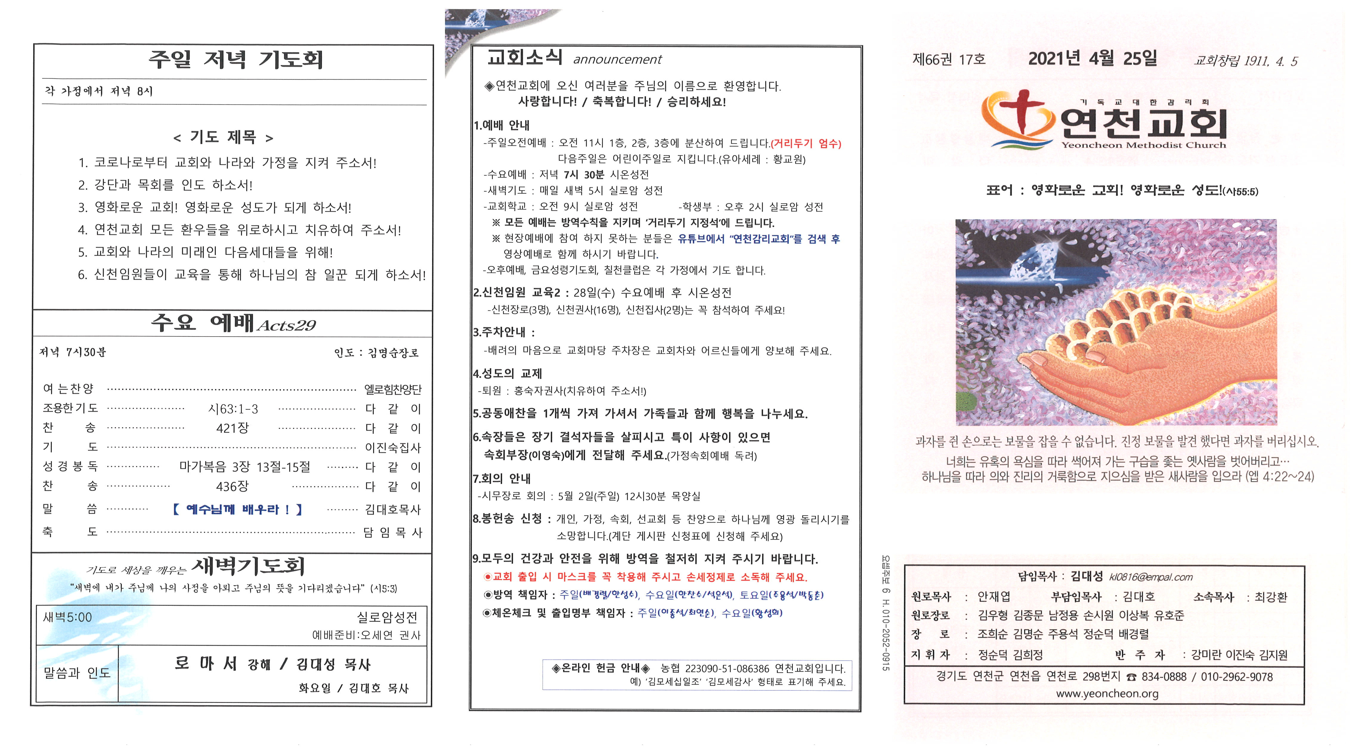 2021년 4월 25일 교회주보 본문 2021년 4월 25일 교회주보2021년 4월 25일 교회주보 샬롬 연천교회 조회 1,417회 2021-04-24 13:53 목록 댓글목록 이전글 2021년 5월 2일 교회주보 21.05.01 다음글 2021년 4월 18일 교회주보 21.04.17