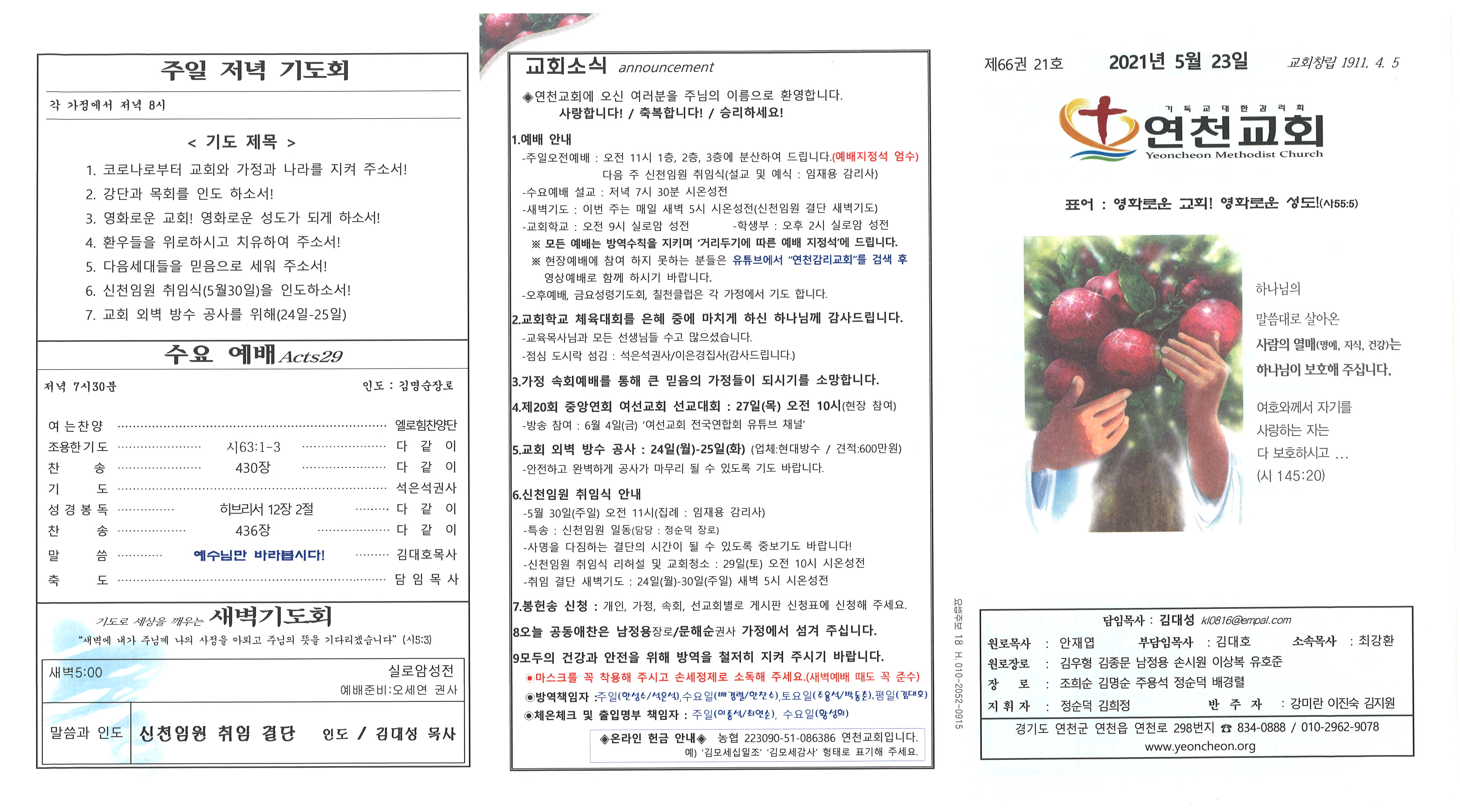 2021년 5월 22일 교회주보 본문 2021년 5월 22일 교회주보2021년 5월 22일 교회주보 샬롬 연천교회 조회 1,328회 2021-05-22 12:30 목록 댓글목록 이전글 2021년 5월 30일 교회주보 21.05.29 다음글 2021년 5월 16일 교회주보 21.05.15