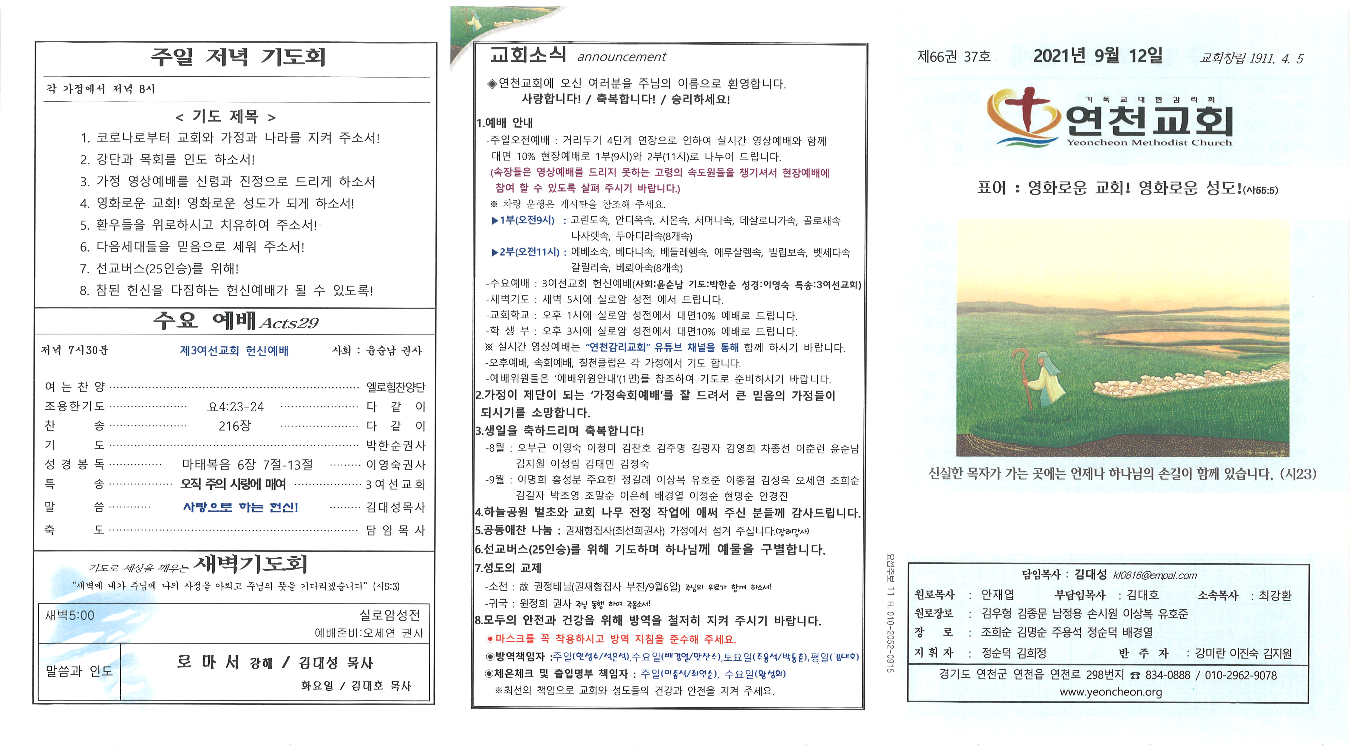 2021년 9월 12일 교회주보 본문 2021년 9월 12일 교회주보2021년 9월 12일 교회주보 샬롬 연천교회 조회 1,182회 2021-09-11 15:23 목록 댓글목록 이전글 2021년 9월 19일 교회주보 21.09.19 다음글 2021년 9월 5일 교회주보 21.09.04