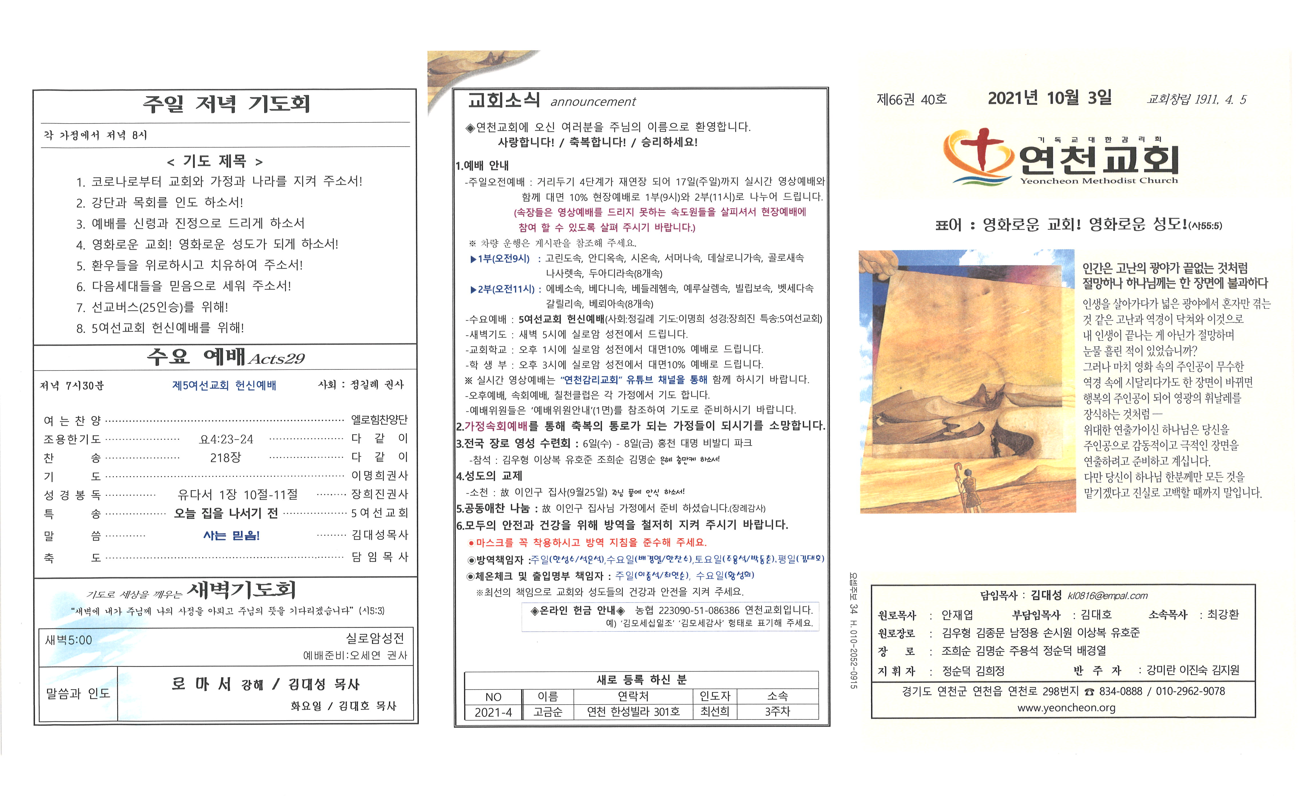 2021년 10월 3일 교회주보 본문 2021년 10월 3일 교회주보2021년 10월 3일 교회주보 샬롬 연천교회 조회 1,109회 2021-10-02 13:21 목록 댓글목록 이전글 2021년 10월 10일 교회주보 21.10.09 다음글 2021년 9월 26일 21.09.25