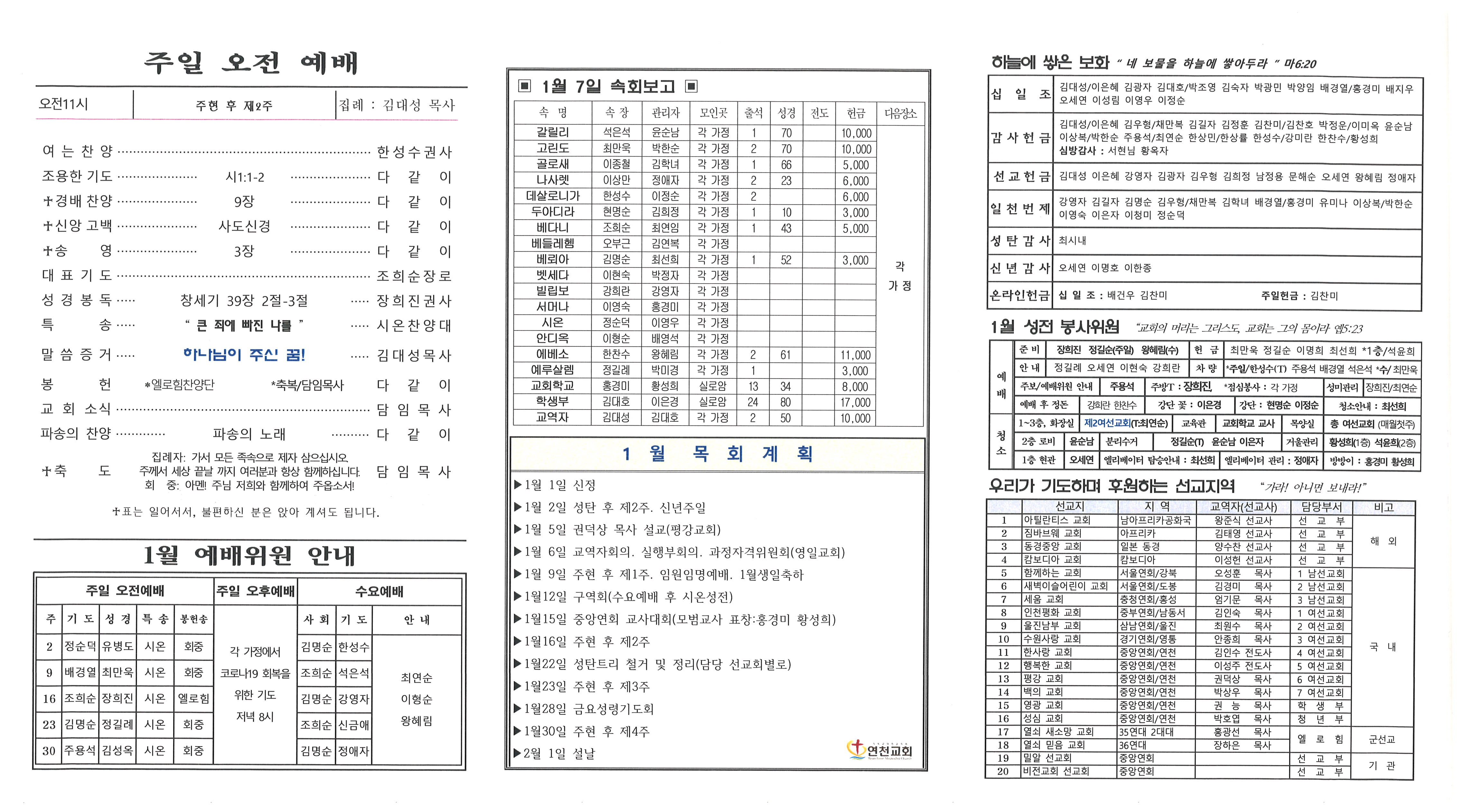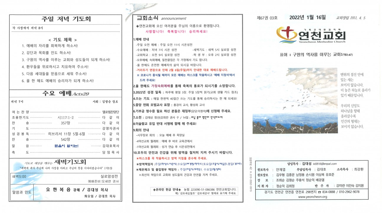 2022년 1월 16일 교회주보 본문 2022년 1월 16일 교회주보2022년 1월 16일 교회주보 샬롬 연천교회 조회 925회 2022-01-21 13:20 목록 댓글목록 이전글 2022년 1월 23일 교회주보 22.01.22 다음글 2022년 1월 9일 교회주보 22.01.08