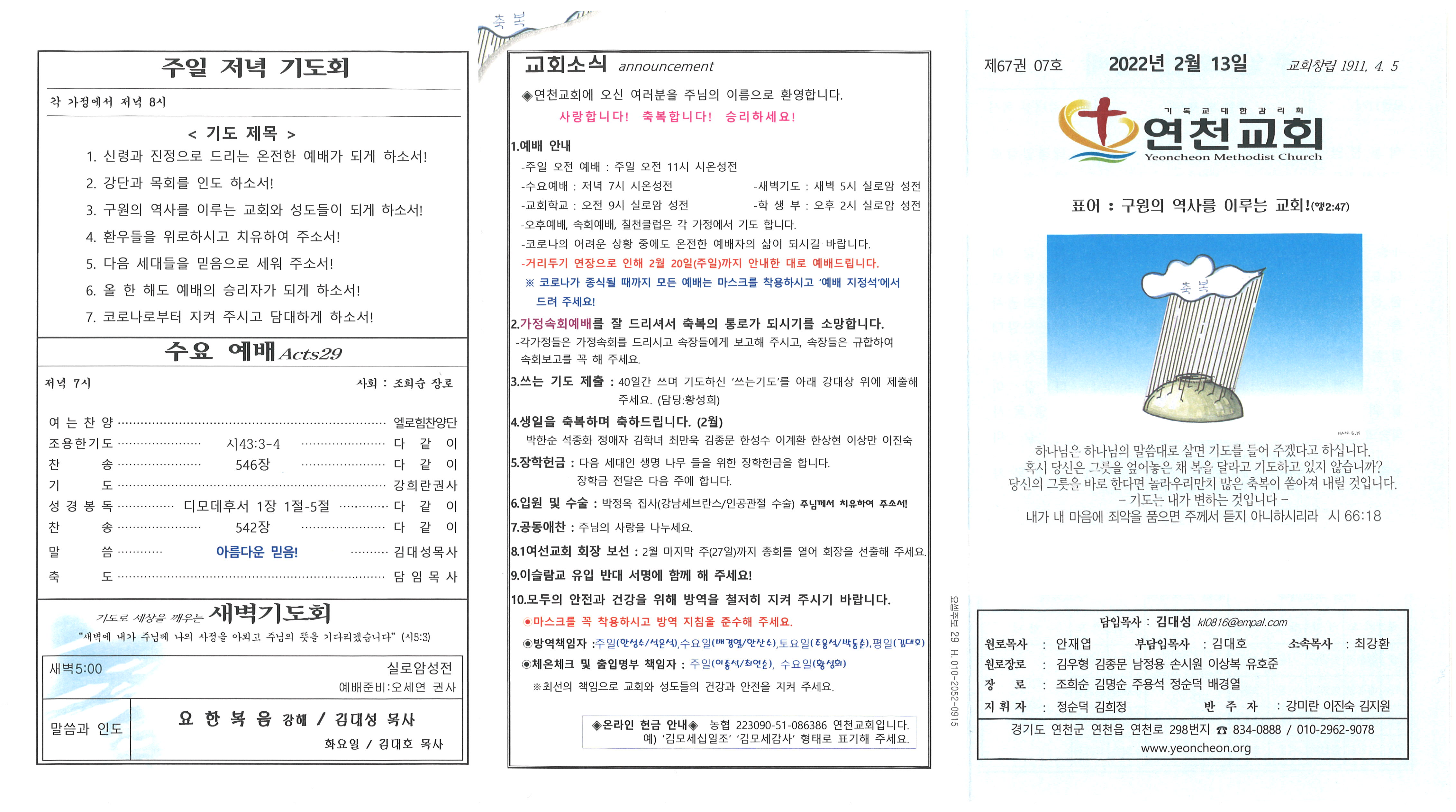 2022년 2월 13일 교회주보 본문 2022년 2월 13일 교회주보2022년 2월 13일 교회주보 샬롬 연천교회 조회 863회 2022-02-12 17:49 목록 댓글목록 이전글 2022년 2월 20일 교회주보 22.02.19 다음글 2022년 2월 6일 교회주보 22.02.05