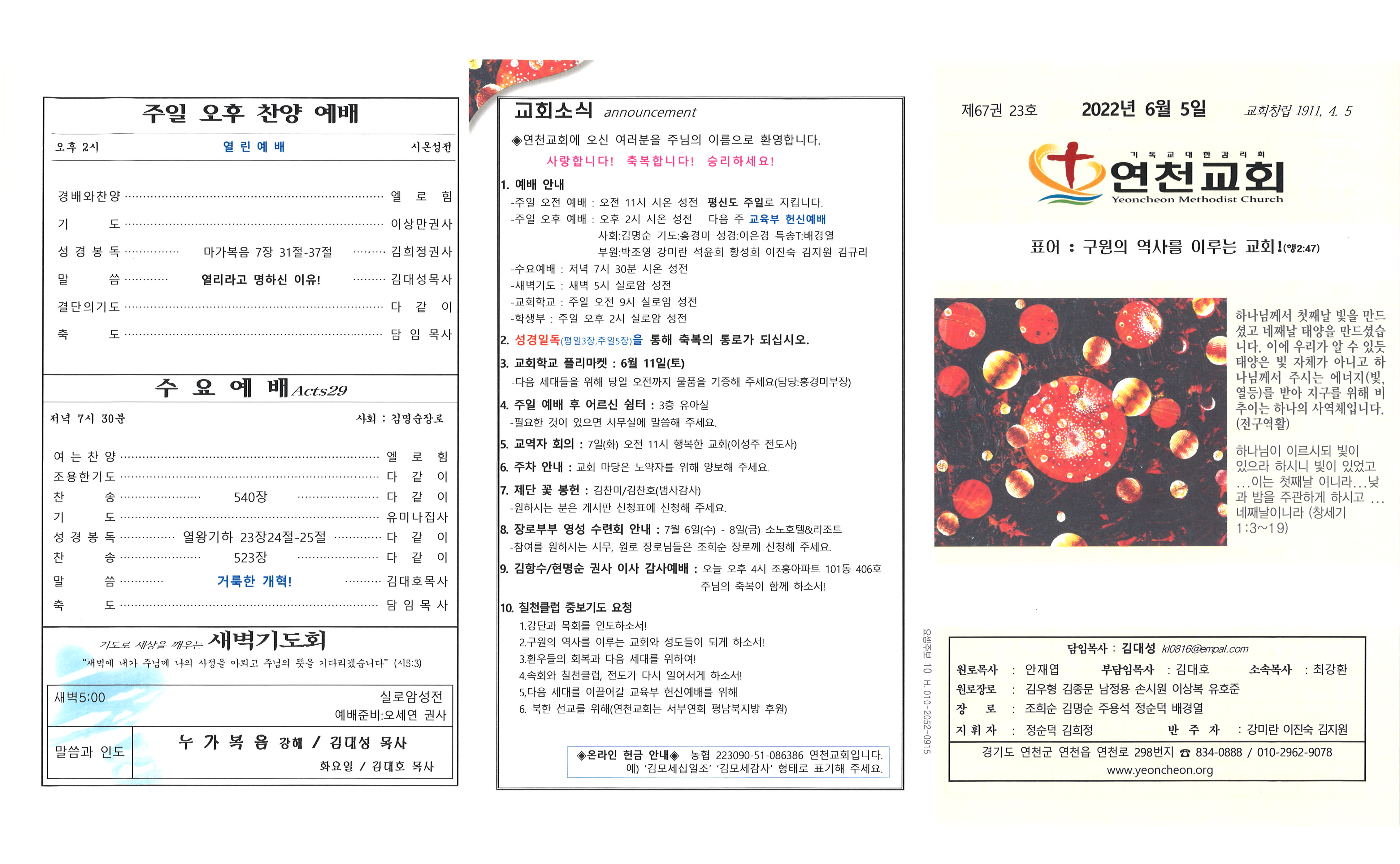 2022년 6월 5일 교회주보 본문 2022년 6월 5일 교회주보2022년 6월 5일 교회주보 샬롬 연천교회 조회 622회 2022-06-04 13:28 목록 댓글목록 이전글 2022년 6월 19일 교회주보 22.06.18 다음글 2022년 5월 29일 교회주보 22.05.28