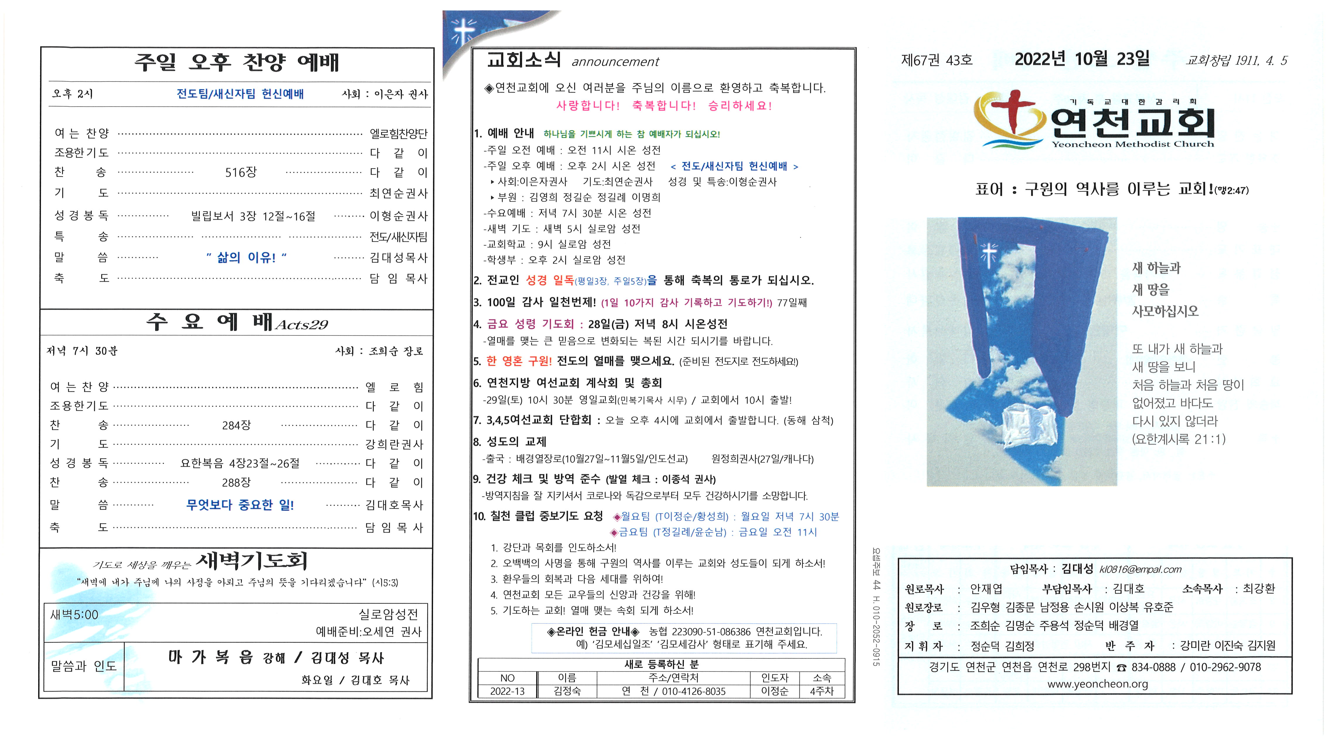 2022년 10월 23일 교회주보 본문 2022년 10월 23일 교회주보2022년 10월 23일 교회주보 샬롬 연천교회 조회 480회 2022-10-22 11:21 목록 댓글목록 이전글 2022년 10월 30일 교회주보 22.10.29 다음글 2022년 10월 16일 교회주보 22.10.15