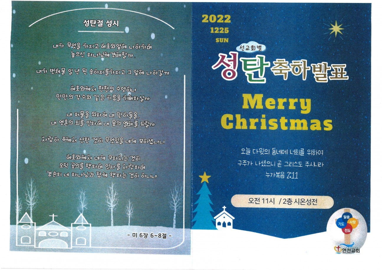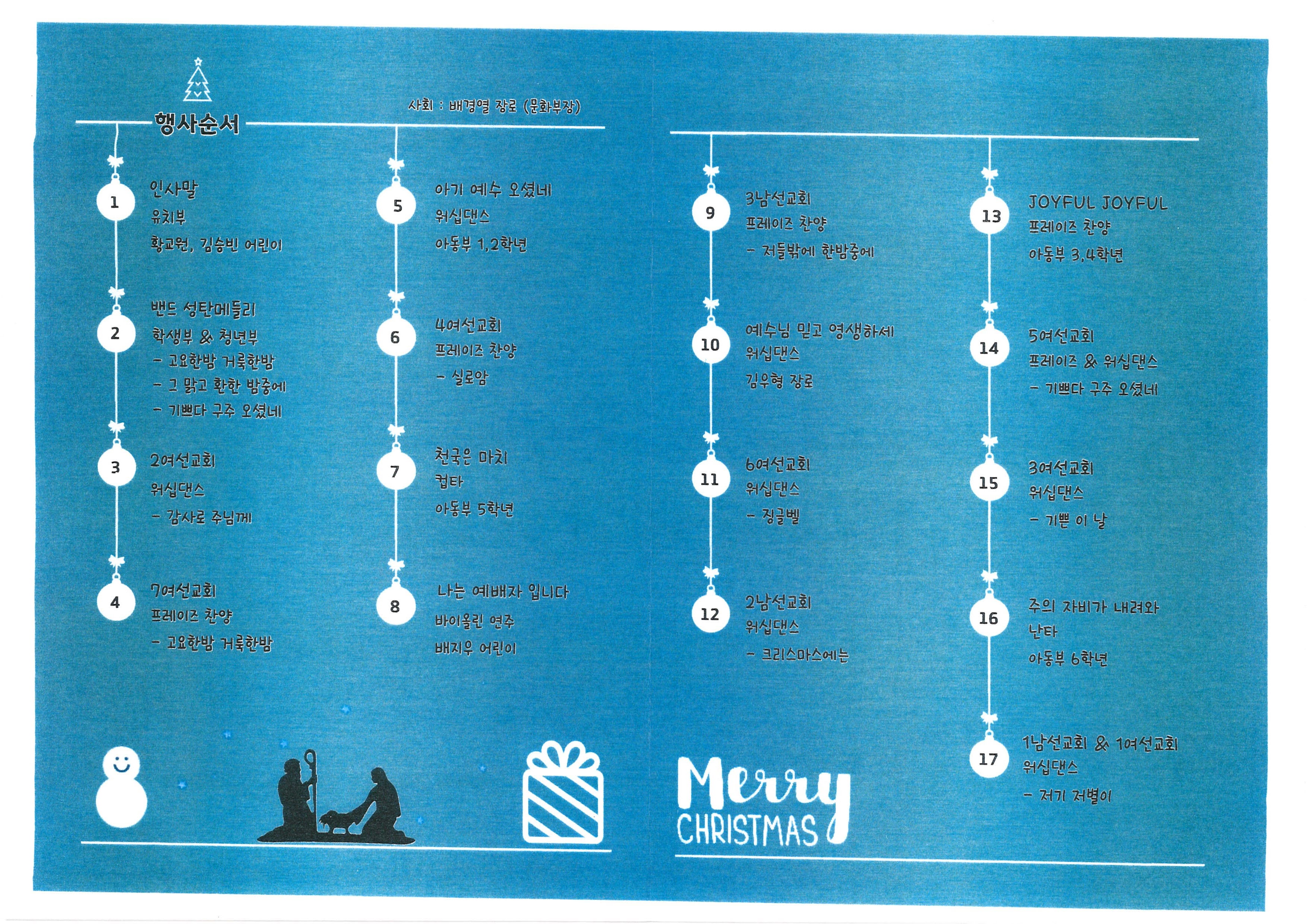 2022년 12월 25일 성탄축하주보 본문 2022년 12월 25일 성탄축하주보2022년 12월 25일 성탄축하주보 샬롬 연천교회 조회 374회 2022-12-30 11:38 목록 댓글목록 이전글 2023년 1월 1일 교회주보 22.12.31 다음글 2022년 12월 25일 교회주보 22.12.24
