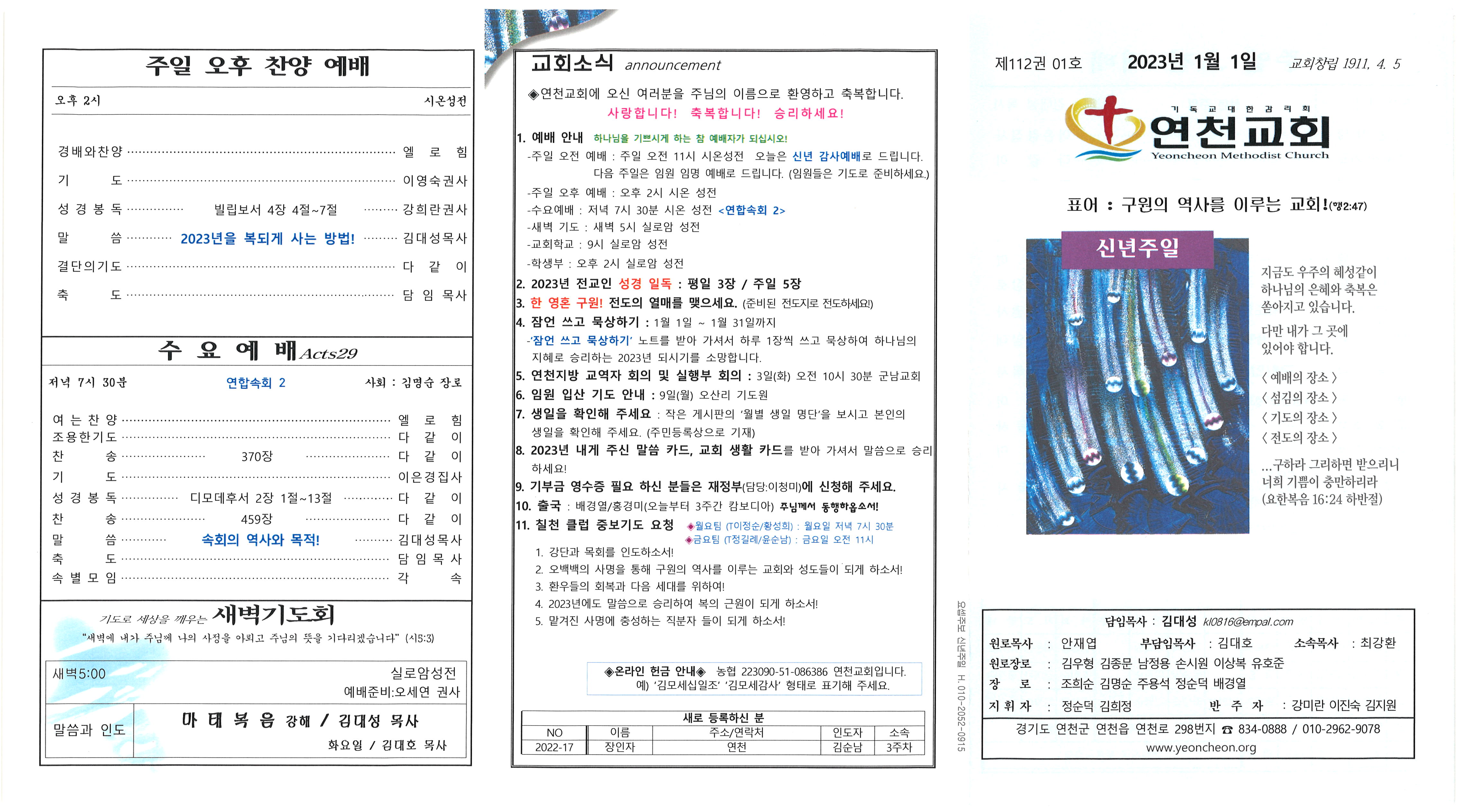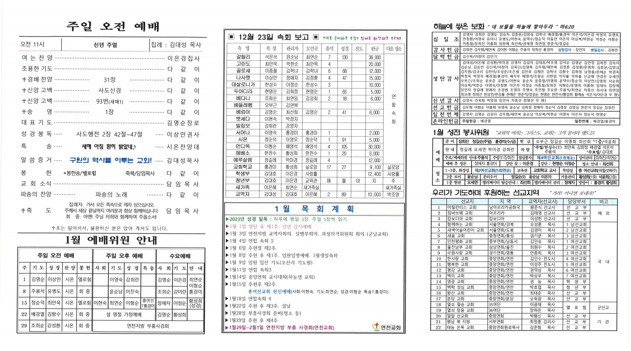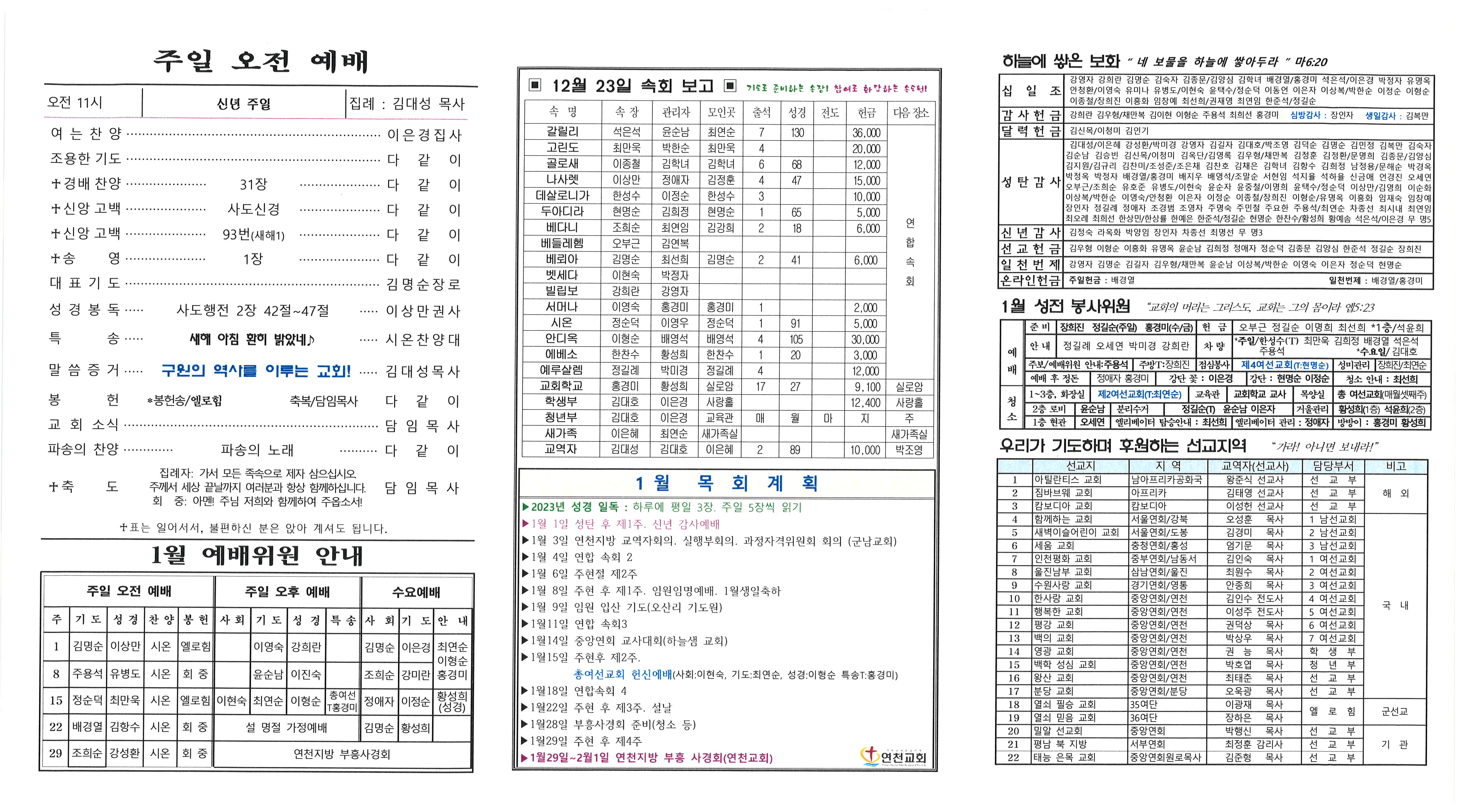2023년 1월 1일 교회주보 본문 2023년 1월 1일 교회주보2023년 1월 1일 교회주보 샬롬 연천교회 조회 384회 2022-12-31 14:58 목록 댓글목록 이전글 2023년 1월 8일 교회주보 23.01.07 다음글 2022년 12월 25일 성탄축하주보 22.12.30