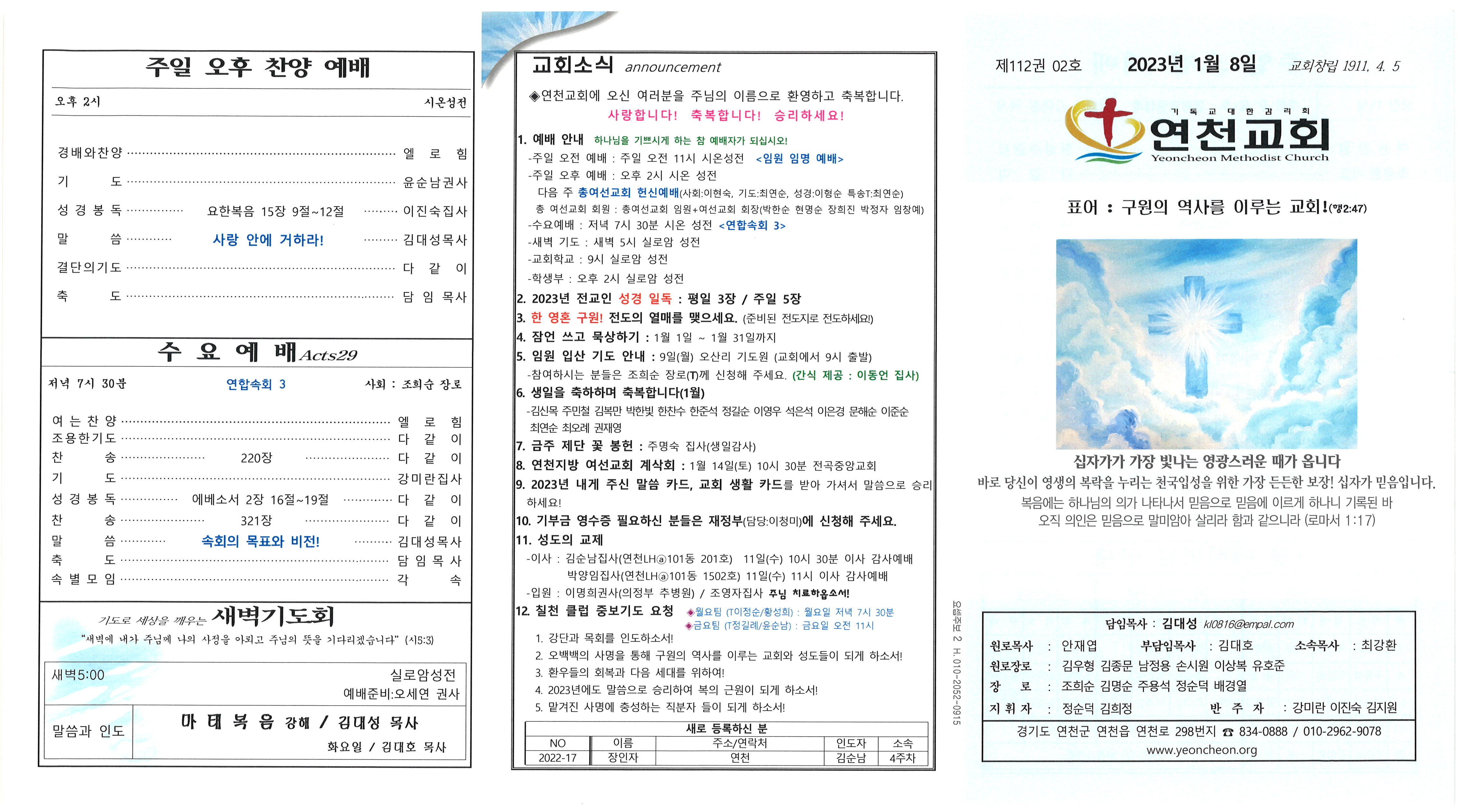 2023년 1월 8일 교회주보 본문 2023년 1월 8일 교회주보2023년 1월 8일 교회주보 샬롬 연천교회 조회 369회 2023-01-07 11:49 목록 댓글목록 이전글 2022년 1월 15일 교회주보 23.01.14 다음글 2023년 1월 1일 교회주보 22.12.31