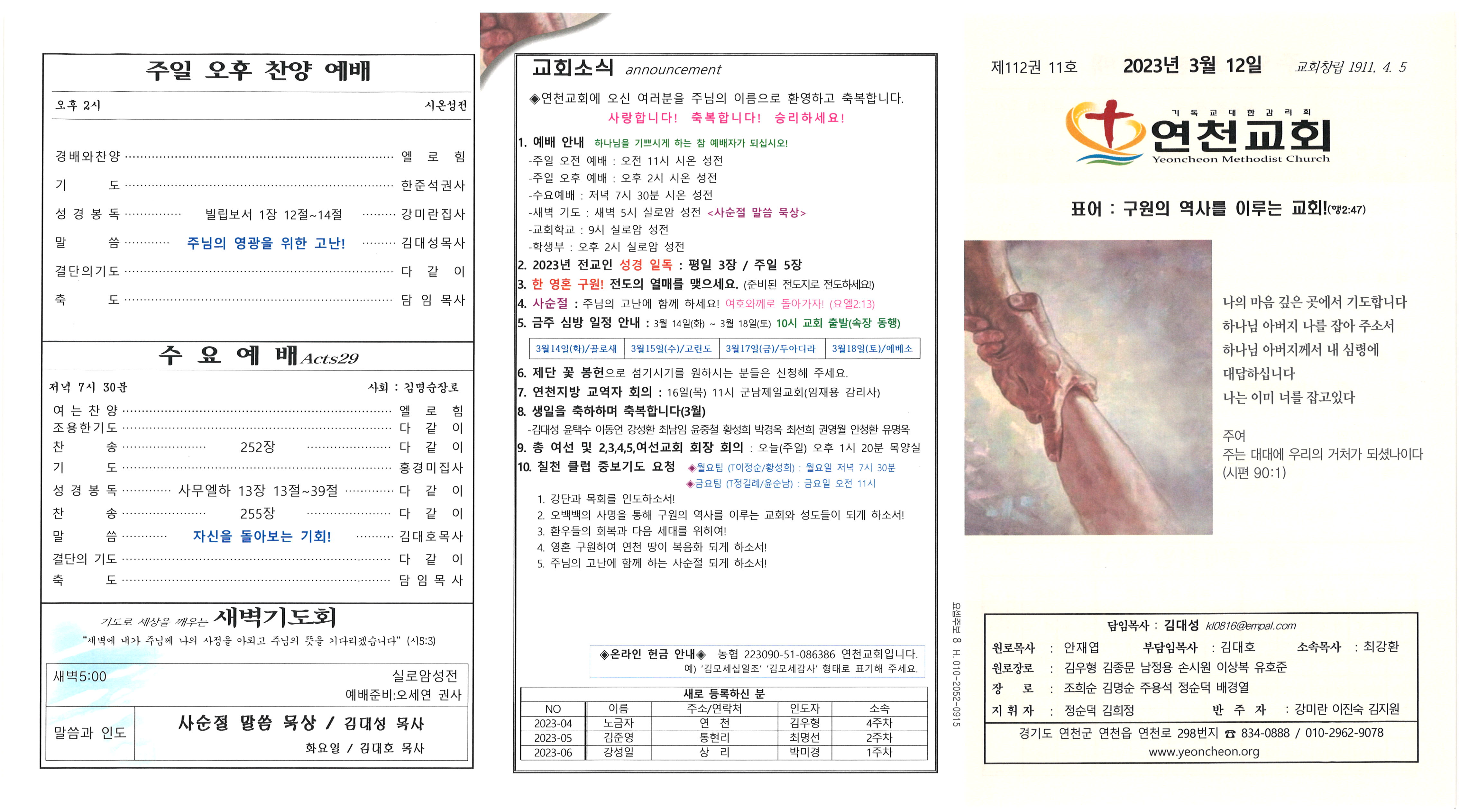 2023년 3월 12일 교회주보 본문 2023년 3월 12일 교회주보2023년 3월 12일 교회주보 샬롬 연천교회 조회 310회 2023-03-11 11:57 목록 댓글목록 이전글 2023년 3월 19일 교회주보 23.03.18 다음글 2023년 3월 5일 교회주보 23.03.04