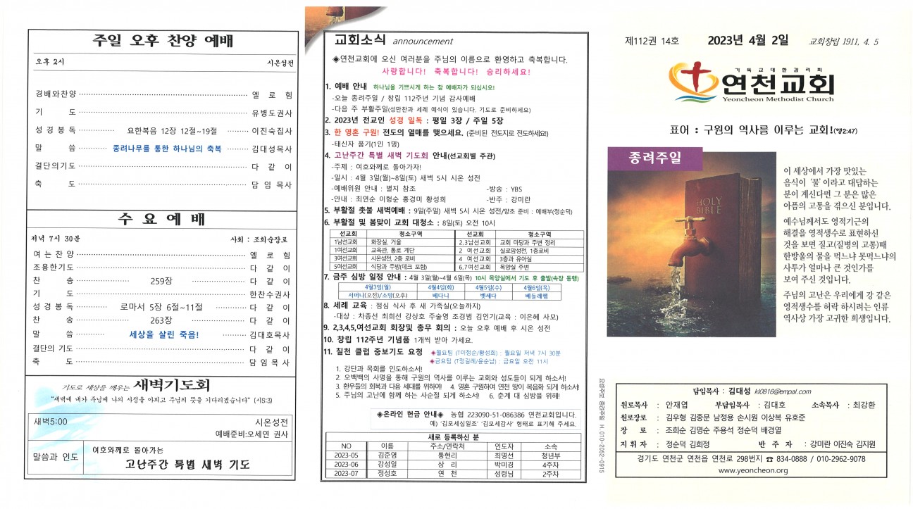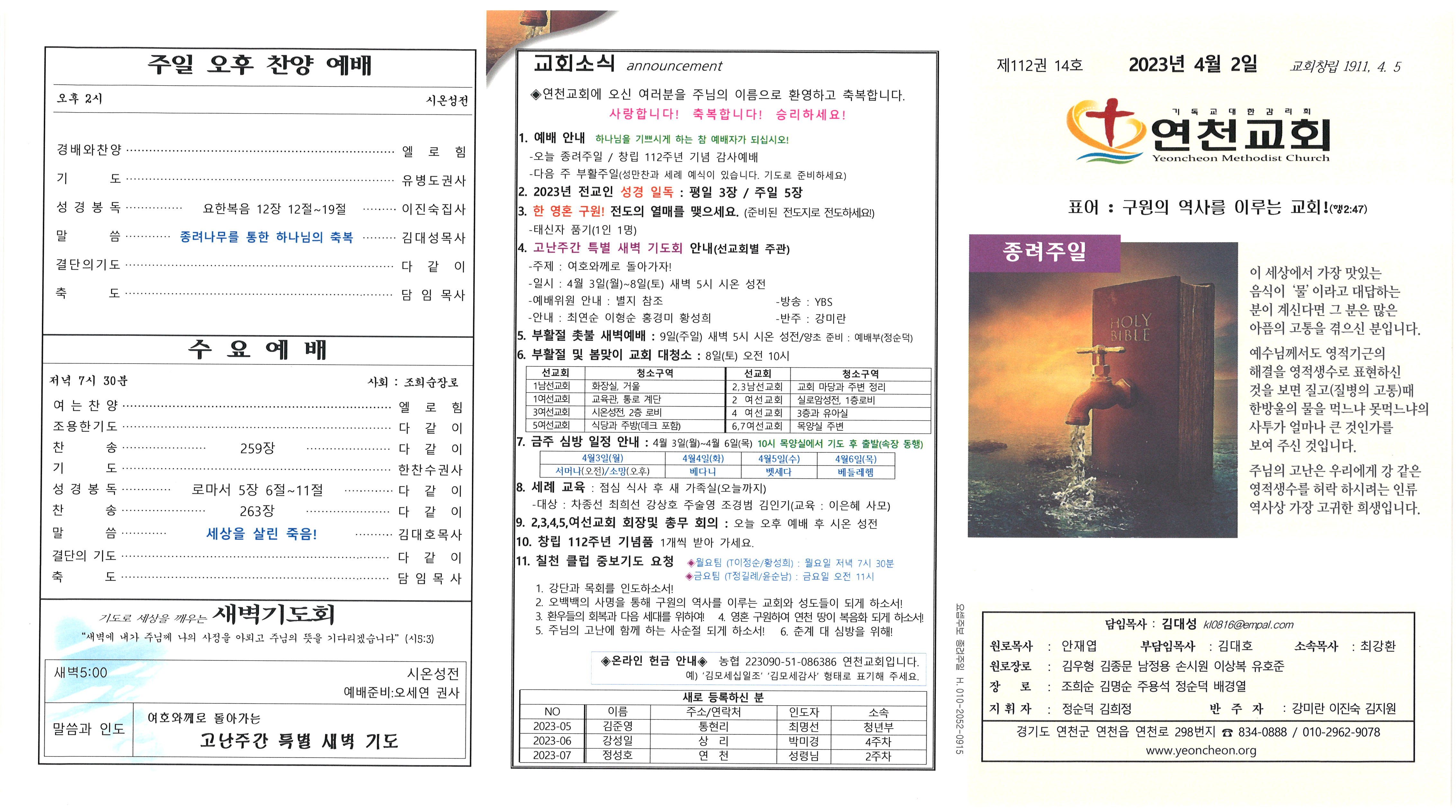 2023년 4월 2일 교회주보 본문 2023년 4월 2일 교회주보2023년 4월 2일 교회주보 샬롬 연천교회 조회 264회 2023-04-01 13:56 목록 댓글목록 이전글 2023년 4월 9일 교회주보 23.04.08 다음글 2023년 3월 26일 교회주보 23.03.25