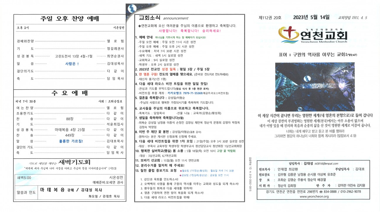 2023년 5월 14일 교회주보 본문 2023년 5월 14일 교회주보2023년 5월 14일 교회주보 샬롬 연천교회 조회 263회 2023-05-13 11:53 목록 댓글목록 이전글 2023년 5월 21일 교회주보 23.05.20 다음글 2023년 5월 7일 교회주보 23.05.06