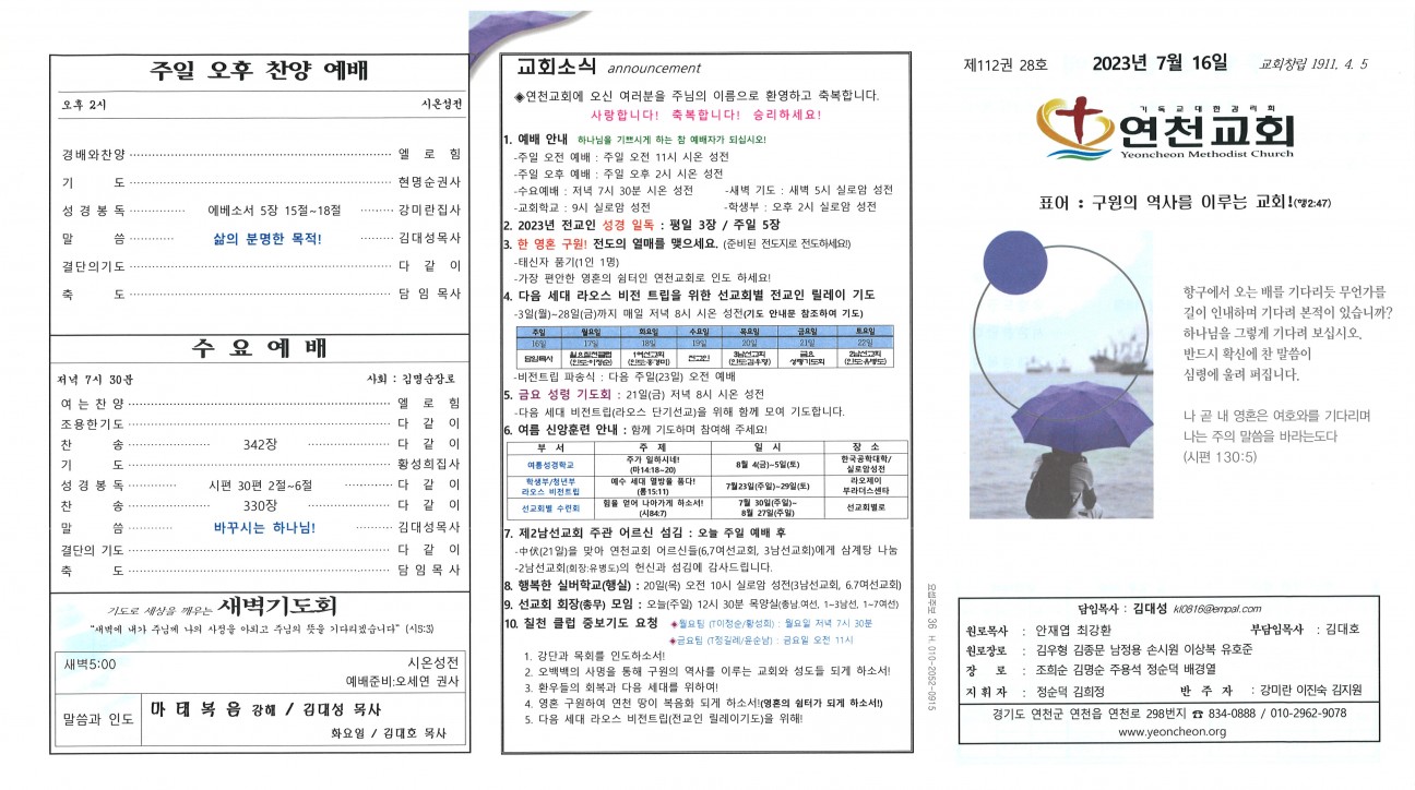 2023년 7월 15일 교회주보 본문 2023년 7월 15일 교회주보2023년 7월 15일 교회주보 샬롬 연천교회 조회 228회 2023-07-15 10:53 목록 댓글목록 이전글 2023년 7월 23일 교회주보 23.07.29 다음글 2023년 7월 9일 교회주보 23.07.08