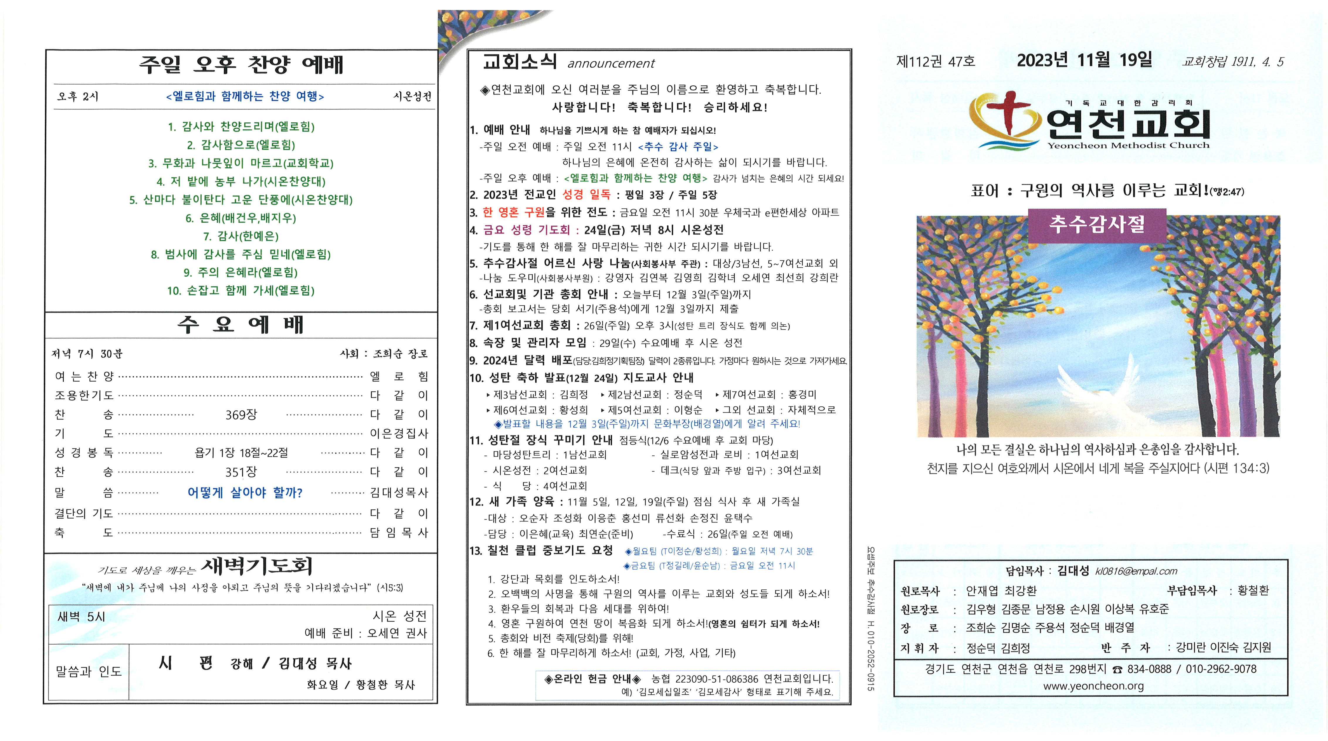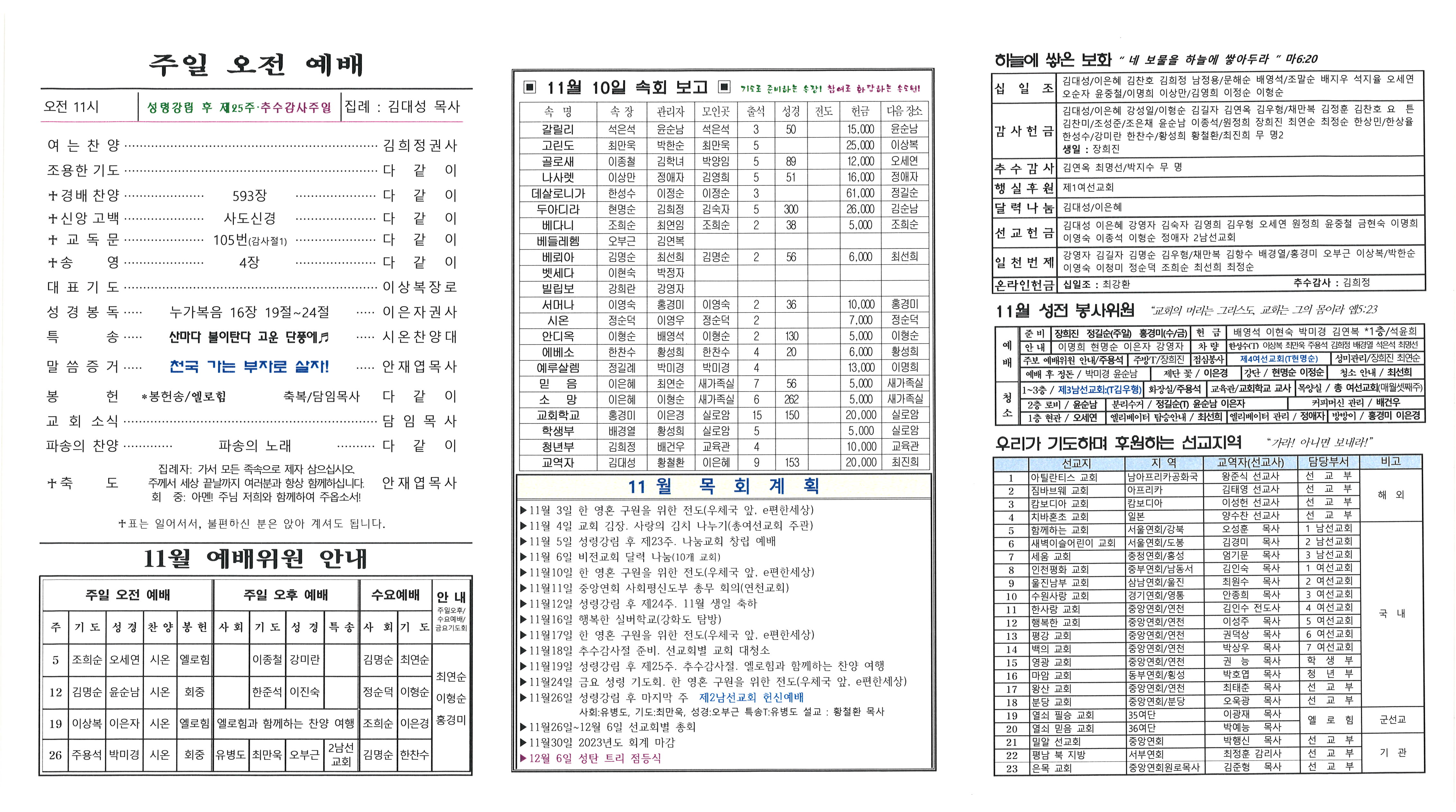 2023년 11월 19일 교회주보 본문 2023년 11월 19일 교회주보2023년 11월 19일 교회주보 샬롬 연천교회 조회 204회 2023-11-18 12:44 목록 댓글목록 이전글 2023년 11월 26일 교회주보 23.11.25 다음글 2023년 11월 12일 교회주보 23.11.11