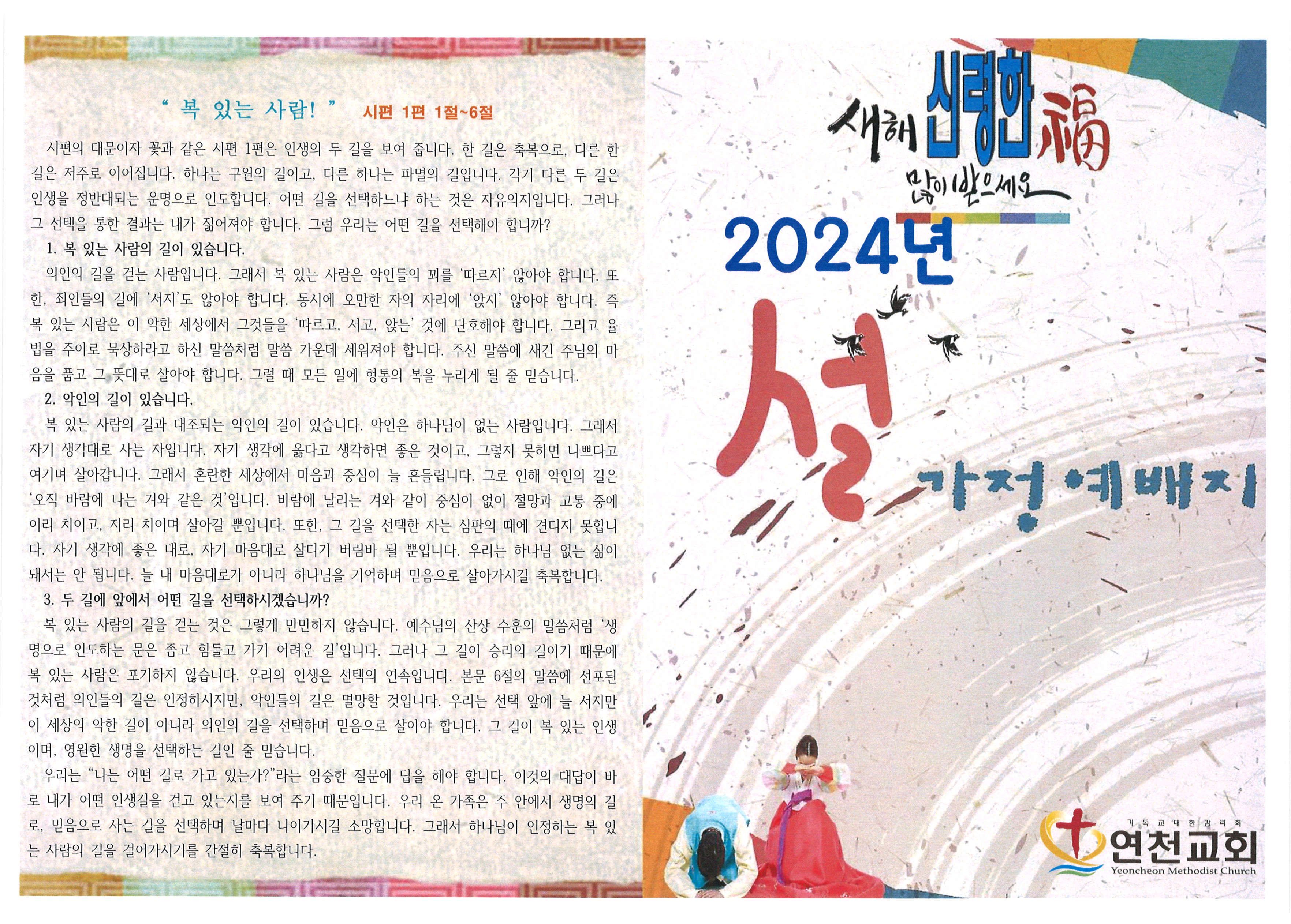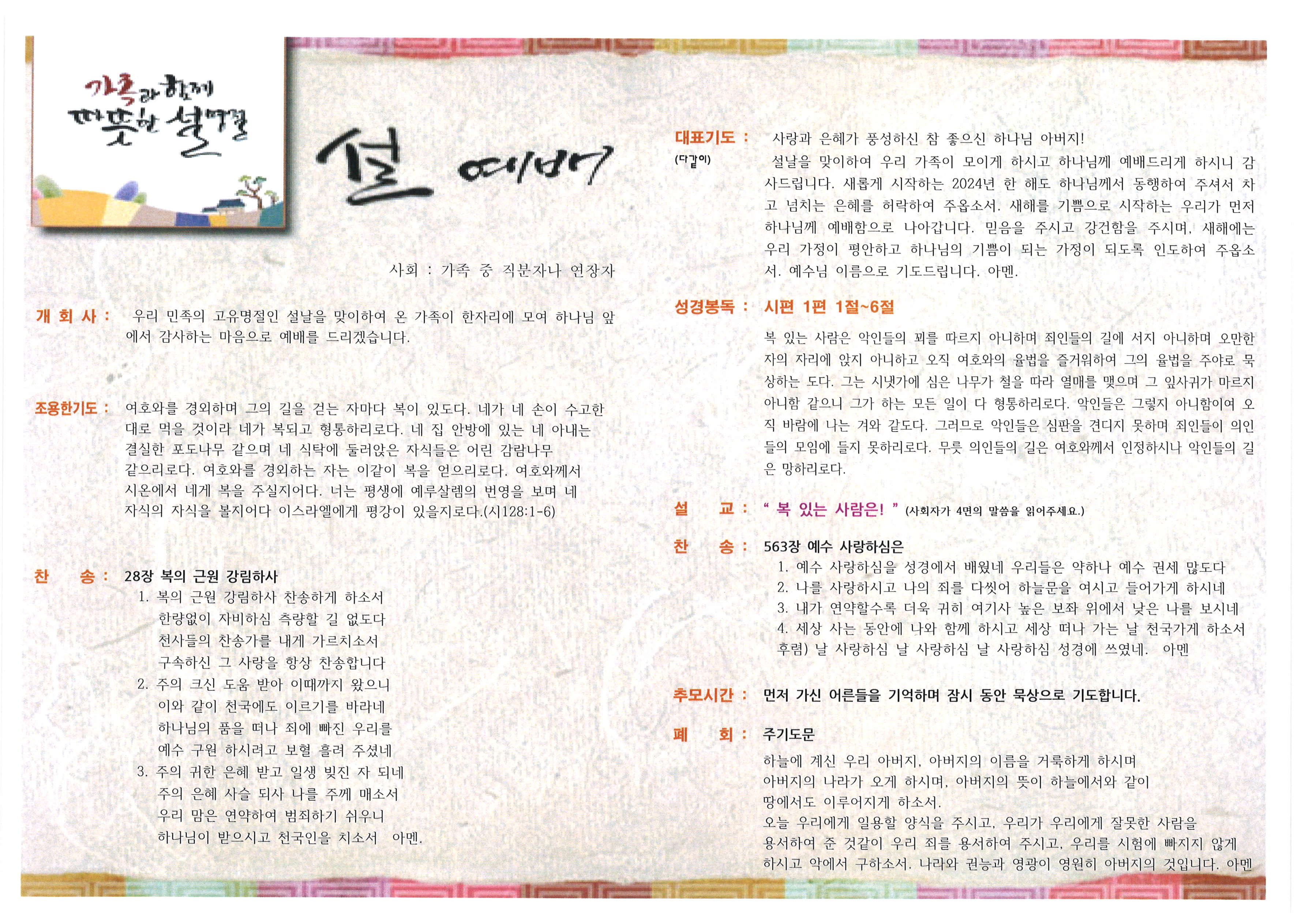 2024년 2월 10일 설 가정예배문 본문 2024년 2월 10일 설 가정예배문2024년 2월 10일 설 가정예배문 즐겁고 은혜스러운 명절 되시길 축복합니다. 연천교회 조회 207회 2024-02-03 10:09 목록 댓글목록 이전글 2024년 2월 11일 교회주보 24.02.09 다음글 2024년 2월 4일 교회주보 24.02.02