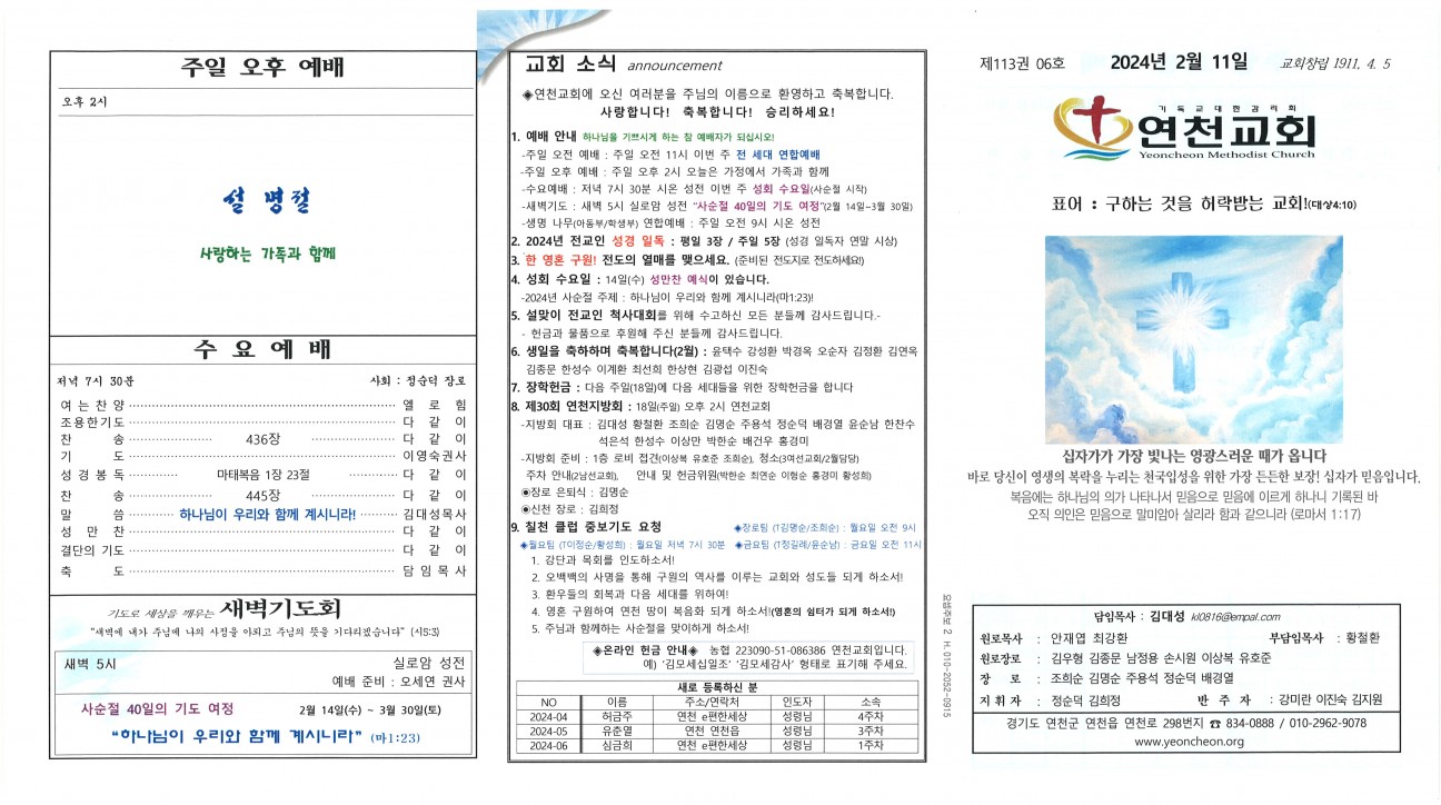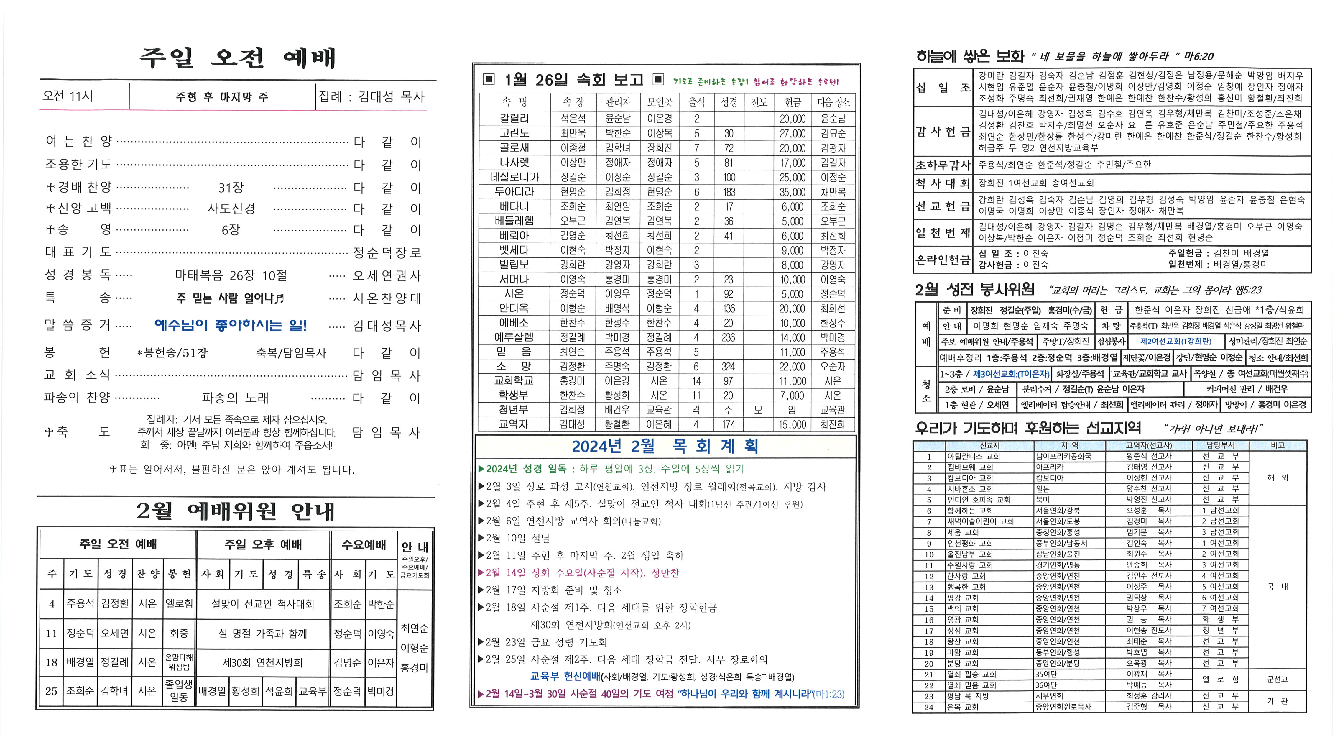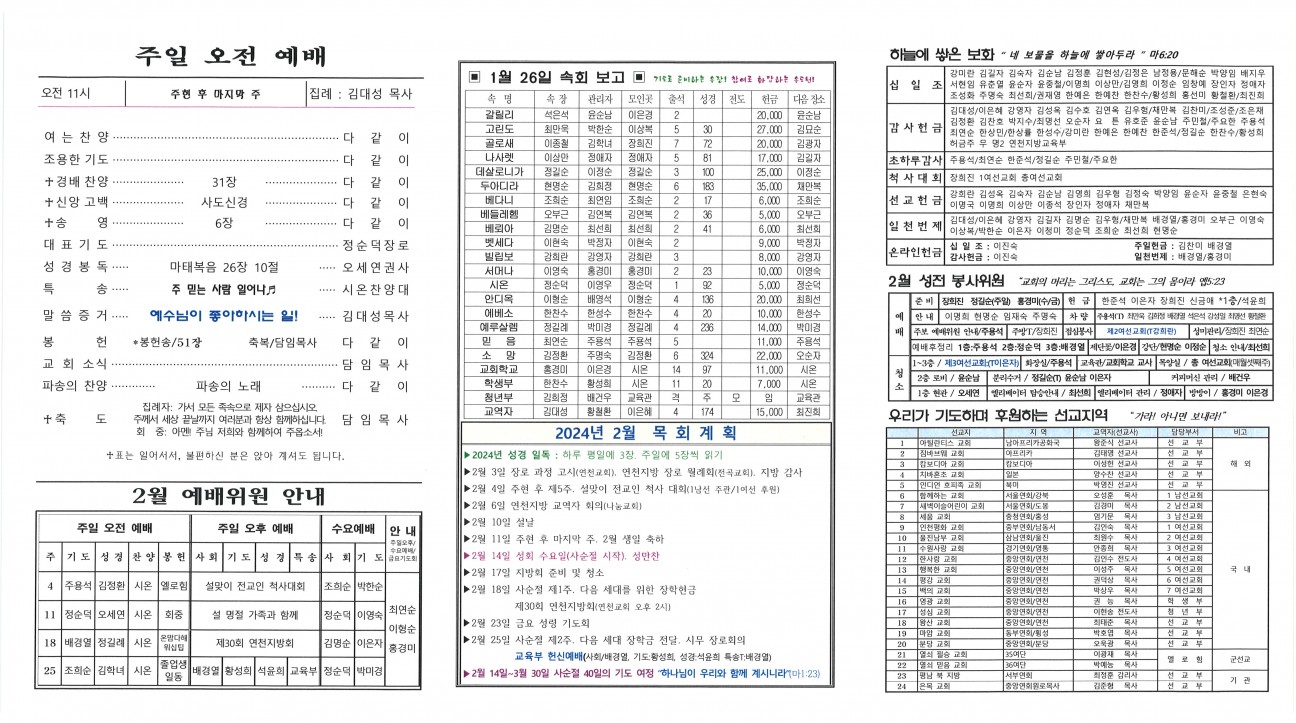 2024년 2월 11일 교회주보 본문 2024년 2월 11일 교회주보2024년 2월 11일 교회주보 샬롬 연천교회 조회 215회 2024-02-09 15:24 목록 댓글목록 이전글 2024년 2월 18일 교회주보 24.02.17 다음글 2024년 2월 10일 설 가정예배문 24.02.03