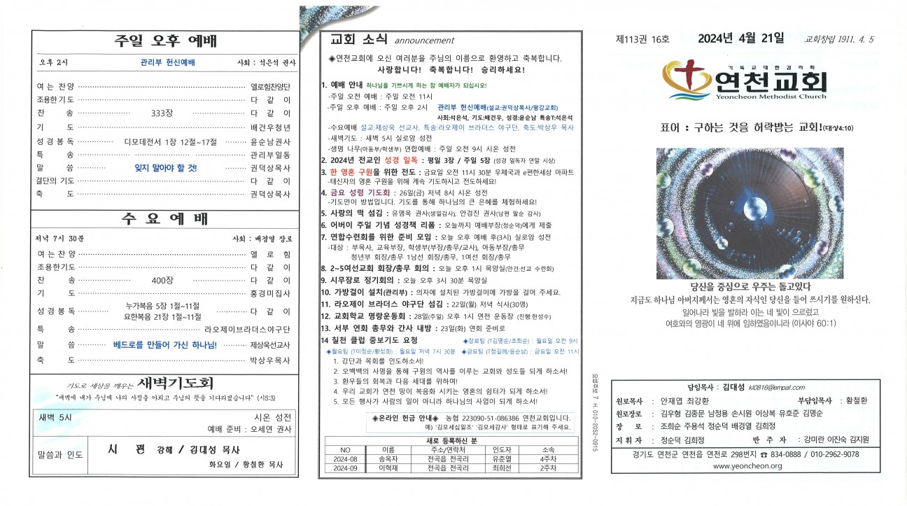 2024년 4월 21일 교회주보 본문 2024년 4월 21일 교회주보2024년 4월 21일 교회주보 샬롬 연천교회 조회 211회 2024-04-20 10:35 목록 댓글목록 이전글 2024년 4월 28일 교회주보 24.04.27 다음글 2024년 4월 14일 교회주보 24.04.13