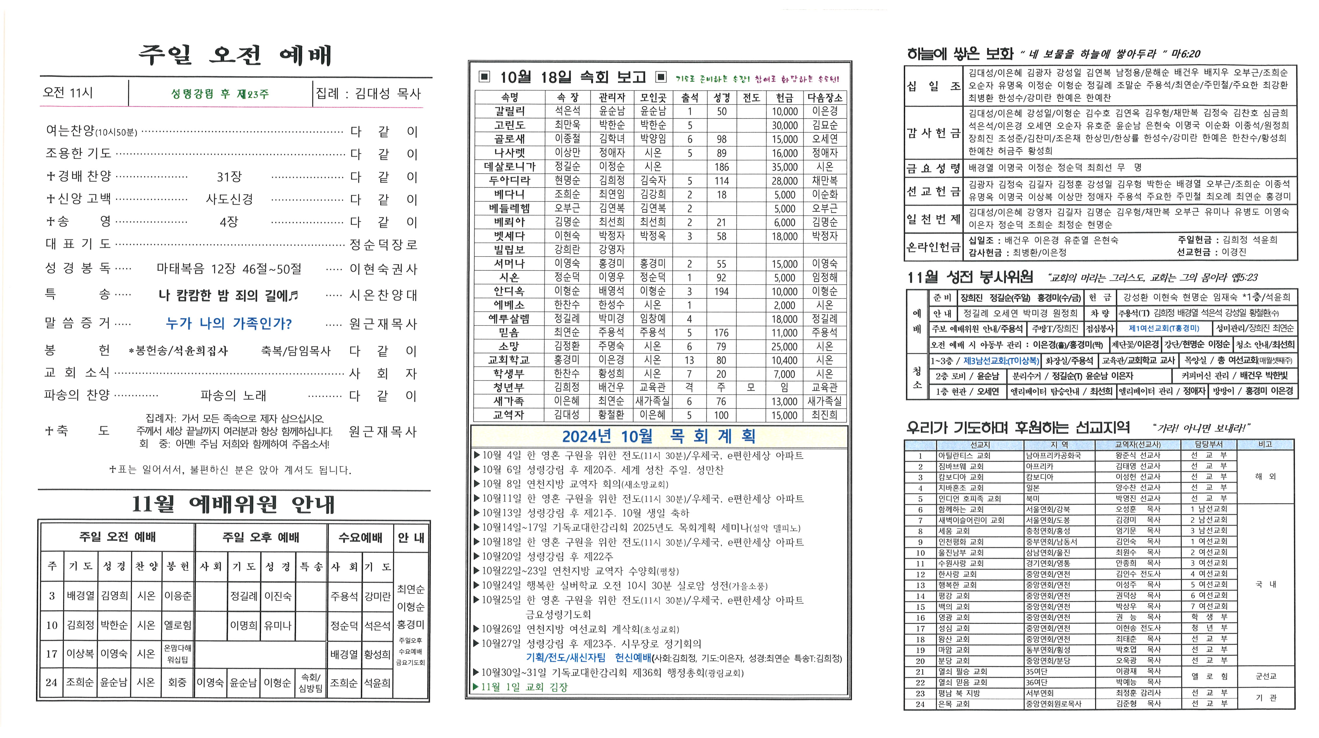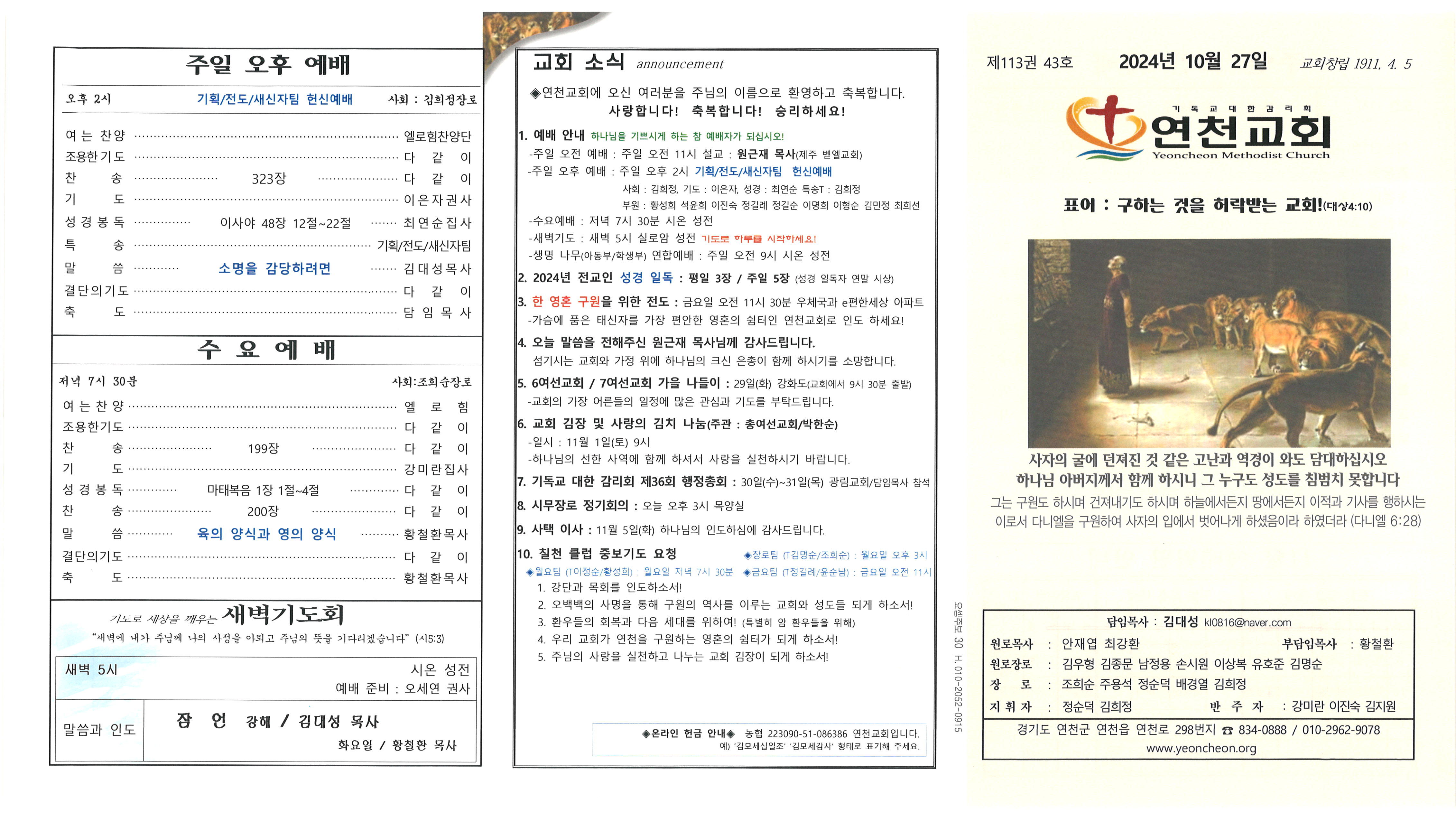 2024년 10월 27일 교회주보 본문 2024년 10월 27일 교회주보2024년 10월 27일 교회주보 샬롬 연천교회 조회 219회 2024-10-26 10:55 목록 댓글목록 이전글 2024년 11월 3일 교회주보 24.11.02 다음글 2024년 10월 20일 교회주보 24.10.19