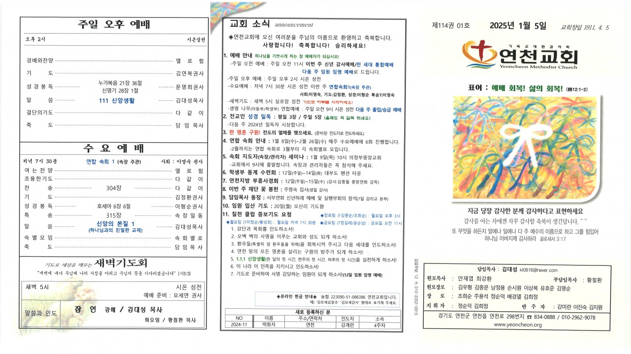 2025년 1월 5일 교회주보 본문 2025년 1월 5일 교회주보2025년 1월 5일 교회주보 샬롬 연천교회 조회 225회 2025-01-04 11:19 목록 댓글목록 이전글 2025년 1월 12일 교회주보 25.01.11 다음글 2024년 12월 29일 교회주보 25.01.04