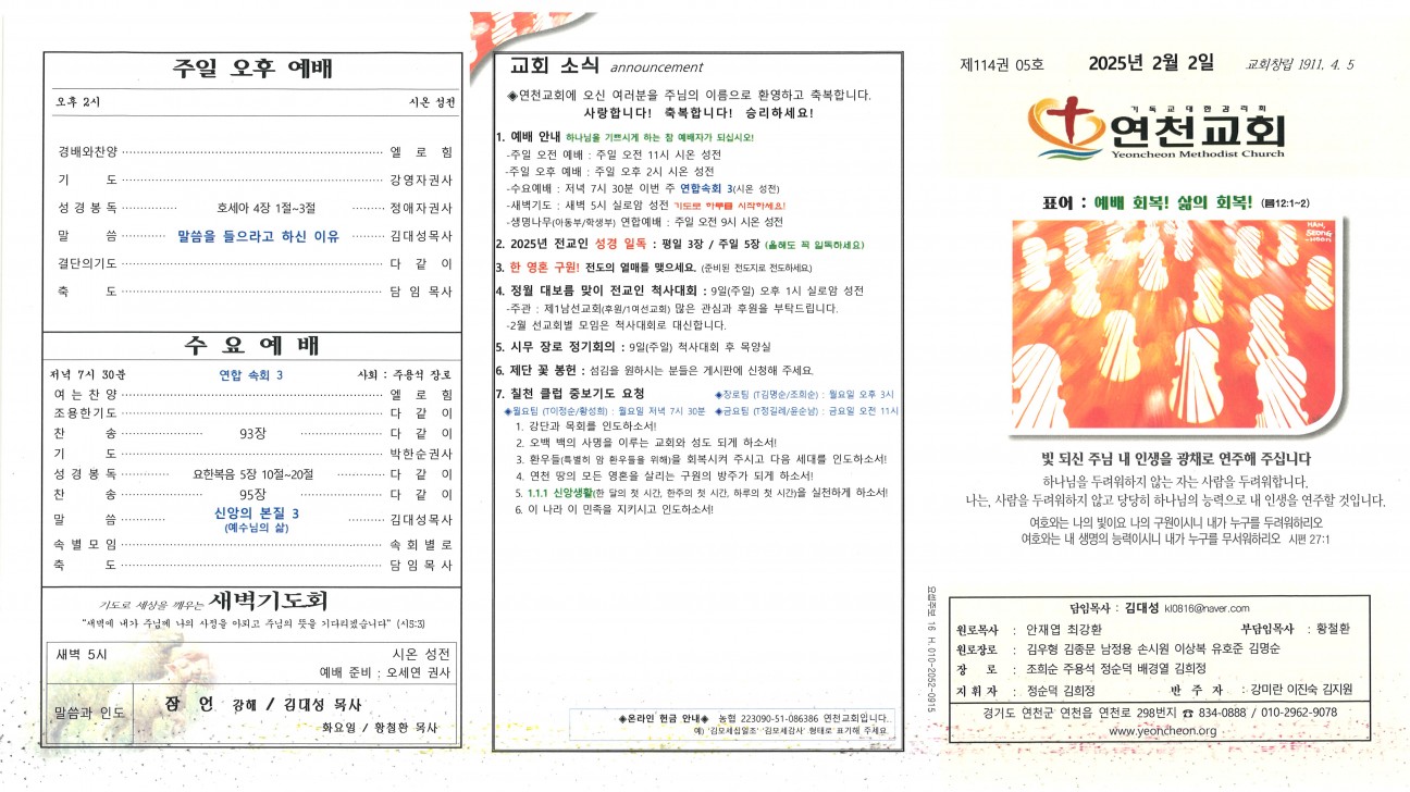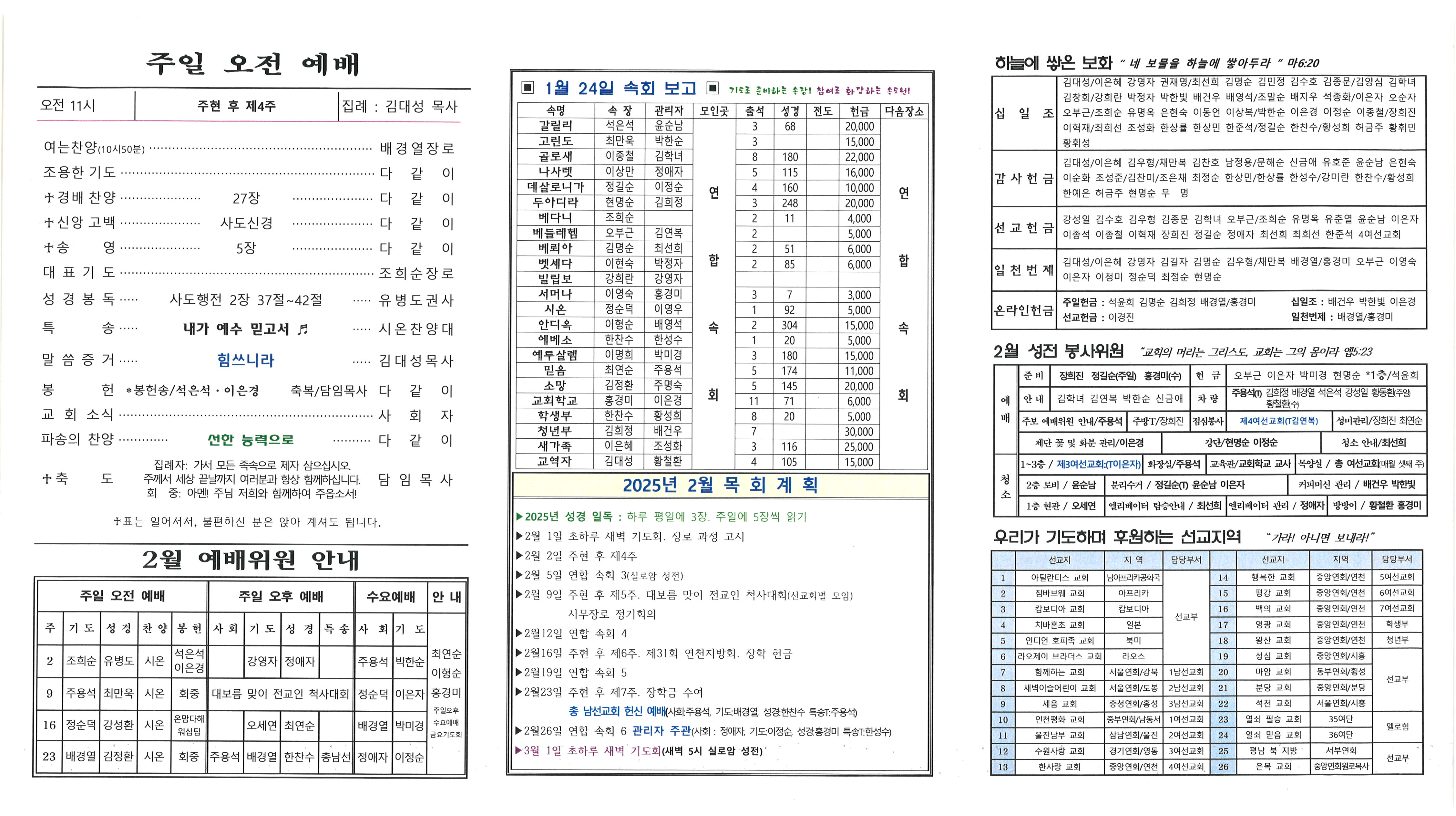 2025년 2월 2일 교회주보 본문 2025년 2월 2일 교회주보2025년 2월 2일 교회주보 샬롬 연천교회 조회 217회 2025-02-01 10:10 목록 댓글목록 이전글 2025년 2월 9일 교회주보 25.02.08 다음글 2025년 1월 26일 교회주보 25.01.25
