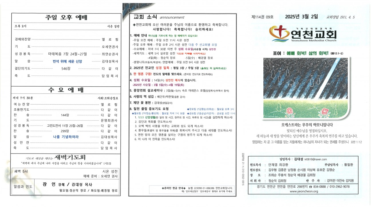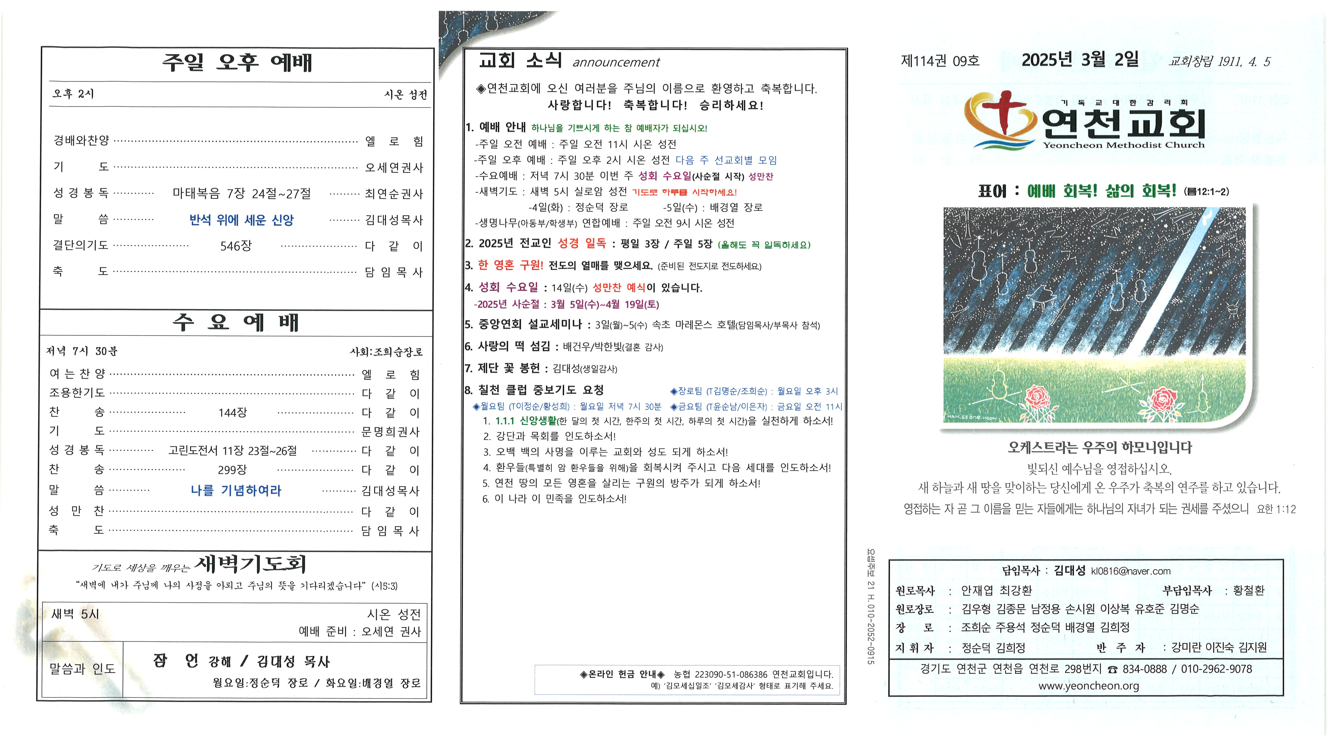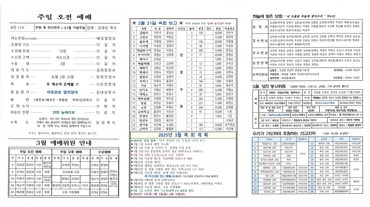 2025년 3월 2일 교회주보 본문 2025년 3월 2일 교회주보2025년 3월 2일 교회주보 샬롬 연천교회 조회 206회 2025-03-01 14:37 목록 댓글목록 이전글 2025년 3월 9일 교회주보 25.03.08 다음글 2025년 2월 23일 교회주보 25.02.23