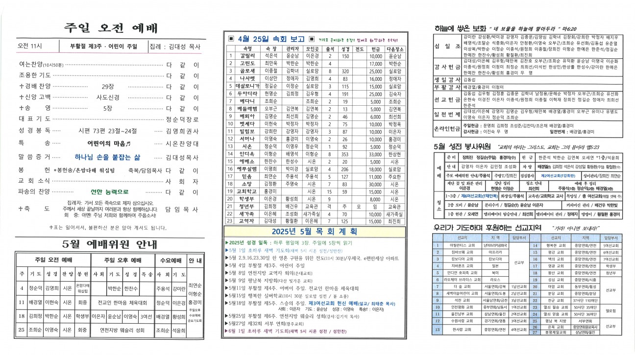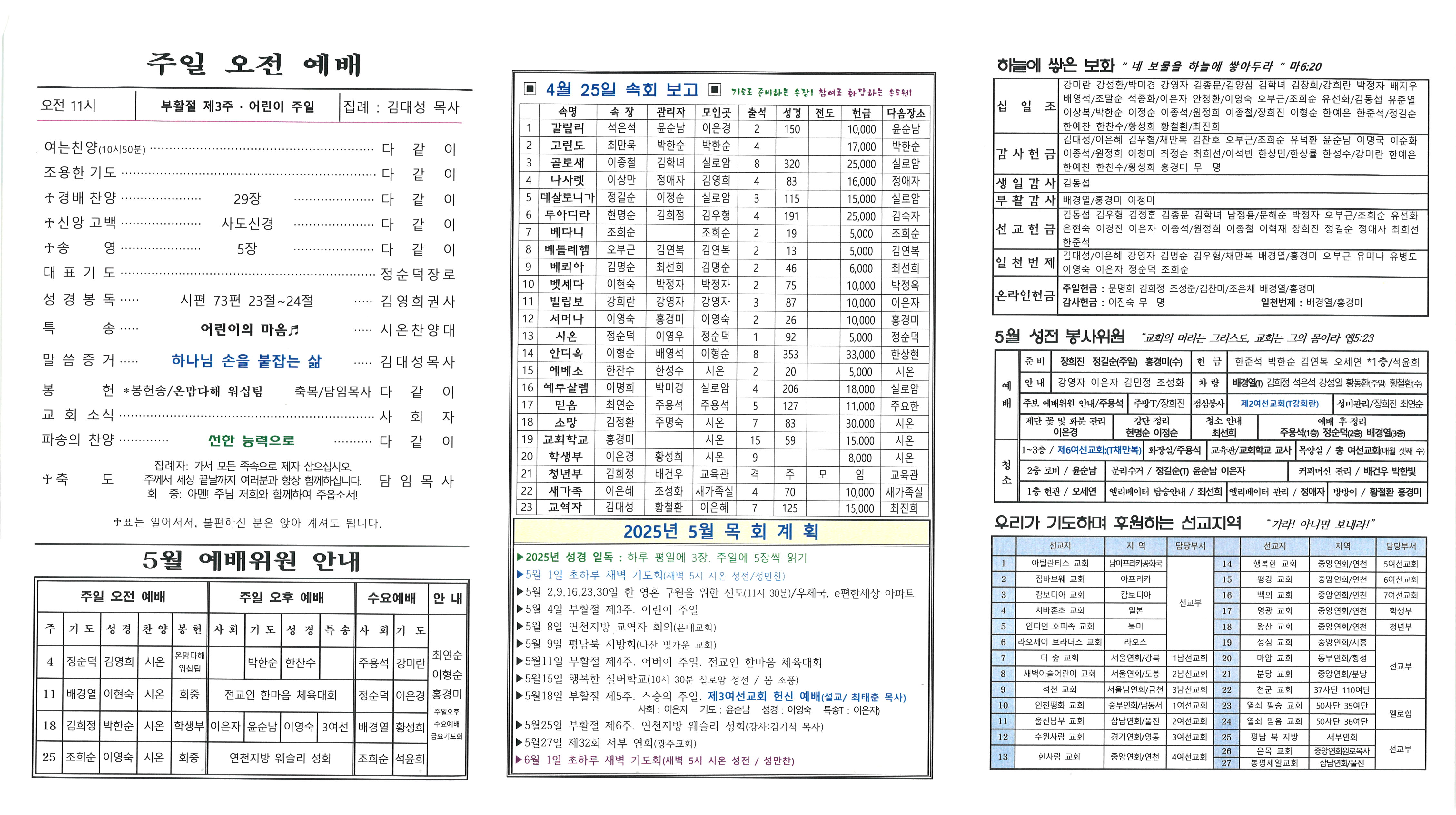 2025년 5월 4일 교회주보 본문 2025년 5월 4일 교회주보2025년 5월 4일 교회주보 샬롬 연천교회 조회 205회 2025-05-03 12:31 목록 댓글목록 이전글 2025년 5월11일 교회주보 25.05.10 다음글 2025년 4월 20일 교회주보 25.04.19