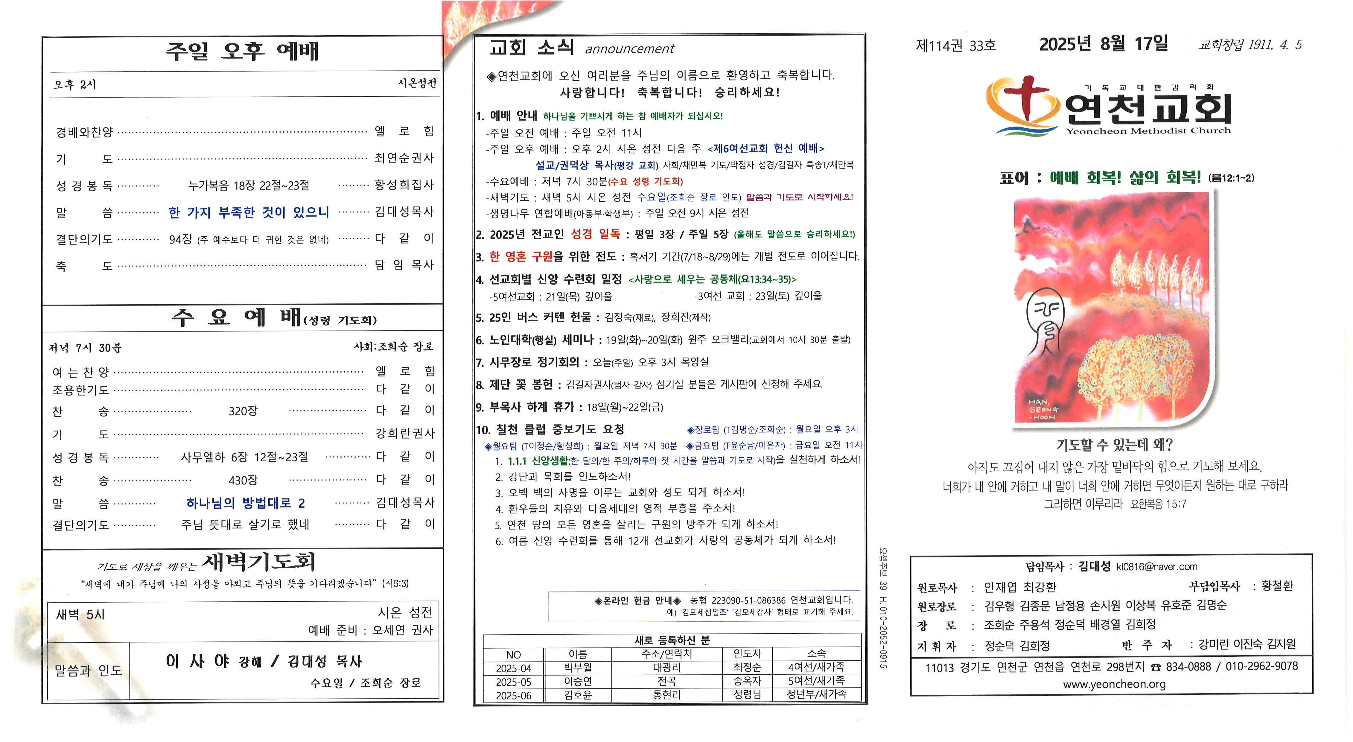 2025년 8월 17일 교회주보 본문 2025년 8월 17일 교회주보2025년 8월 17일 교회주보 샬롬 연천교회 조회 202회 2025-08-16 09:48 목록 댓글목록 이전글 2025년 8월 24일 교회주보 25.08.23 다음글 2025년 8월 10일 교회주보 25.08.09