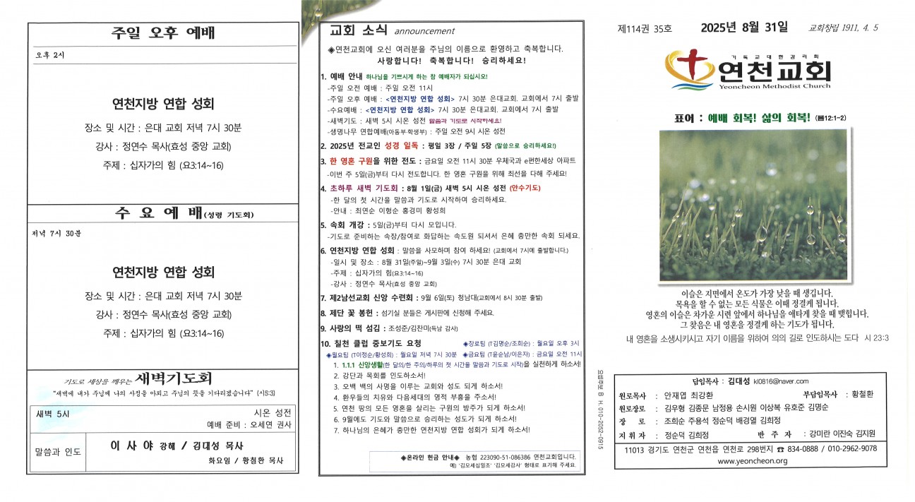 Warning: chmod(): Operation not permitted in /home/chweb/yeoncheon/lib/thumbnail.lib.php on line 631 2025년 8월 31일 교회주보 | 교회주보
