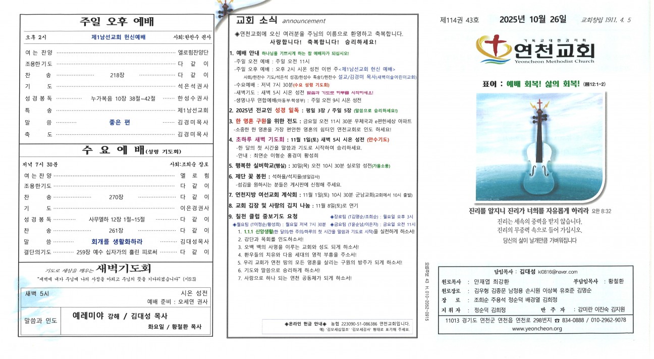 2025년 10월 26일 교회주보 본문 2025년 10월 26일 교회주보2025년 10월 26일 교회주보 샬롬 연천교회 조회 130회 2025-10-25 10:32 목록 댓글목록 이전글 2025년 11월 2일 교회주보 25.11.01 다음글 2025년 10월 19일 교회주보 25.10.18