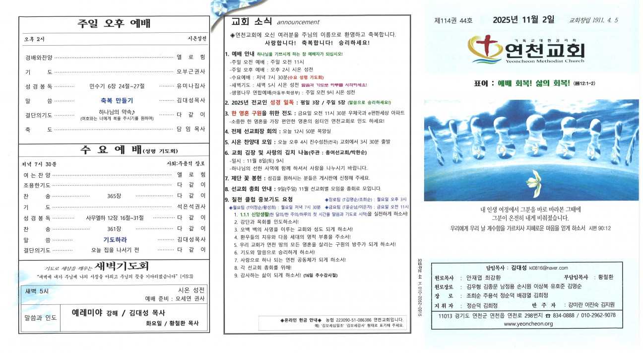 2025년 11월 2일 교회주보 본문 2025년 11월 2일 교회주보2025년 11월 2일 교회주보 신령과 진정으로 드리는 예배가 되게 하소서! 연천교회 조회 123회 2025-11-01 09:52 목록 댓글목록 이전글 2025년 11월 9일 교회주보 25.11.08 다음글 2025년 10월 26일 교회주보 25.10.25