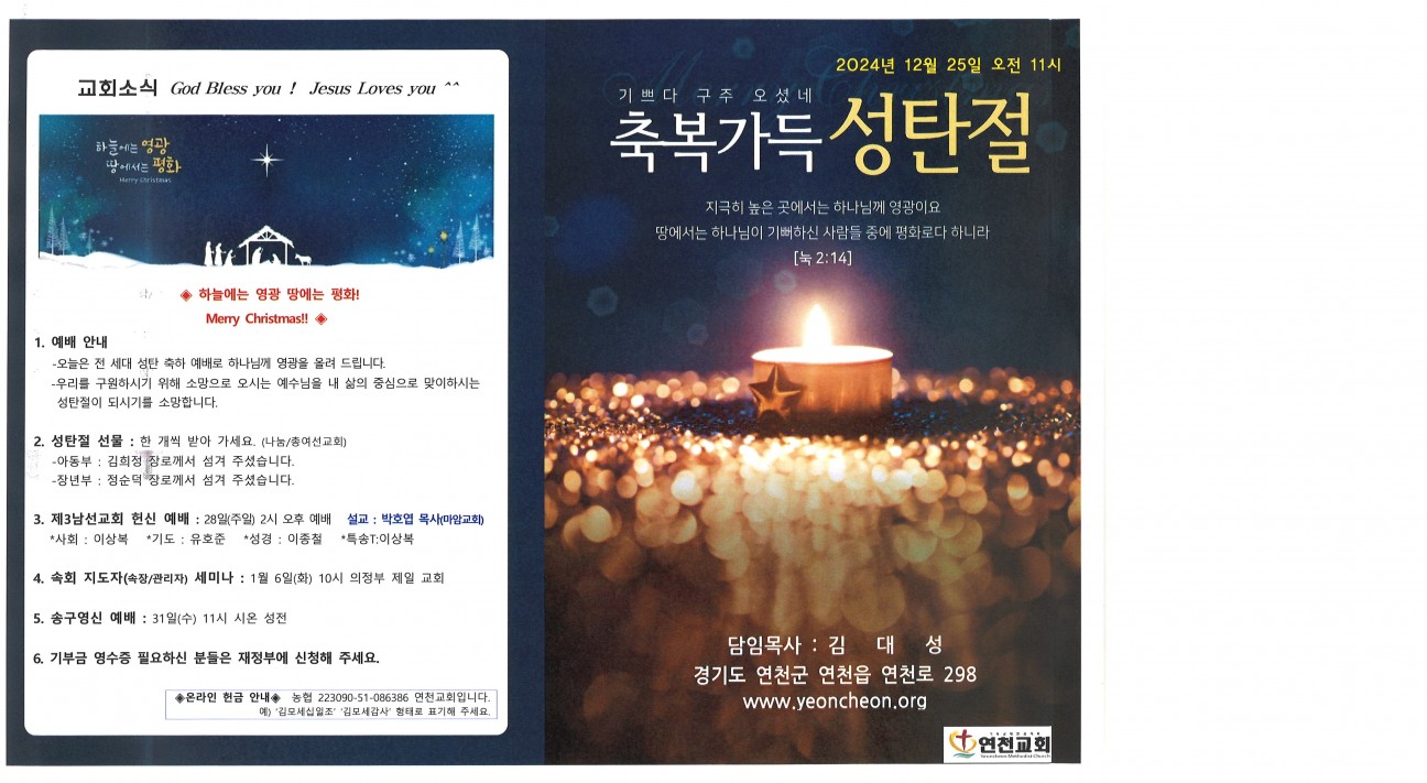 2025년 12월 25일 성탄주보 본문 2025년 12월 25일 성탄주보2025년 12월 25일 성탄주보 성탄을 축하합니다 연천교회 조회 6회 2025-12-20 10:54 목록 댓글목록 다음글 2025년 12월 21일 교회주보 25.12.20
